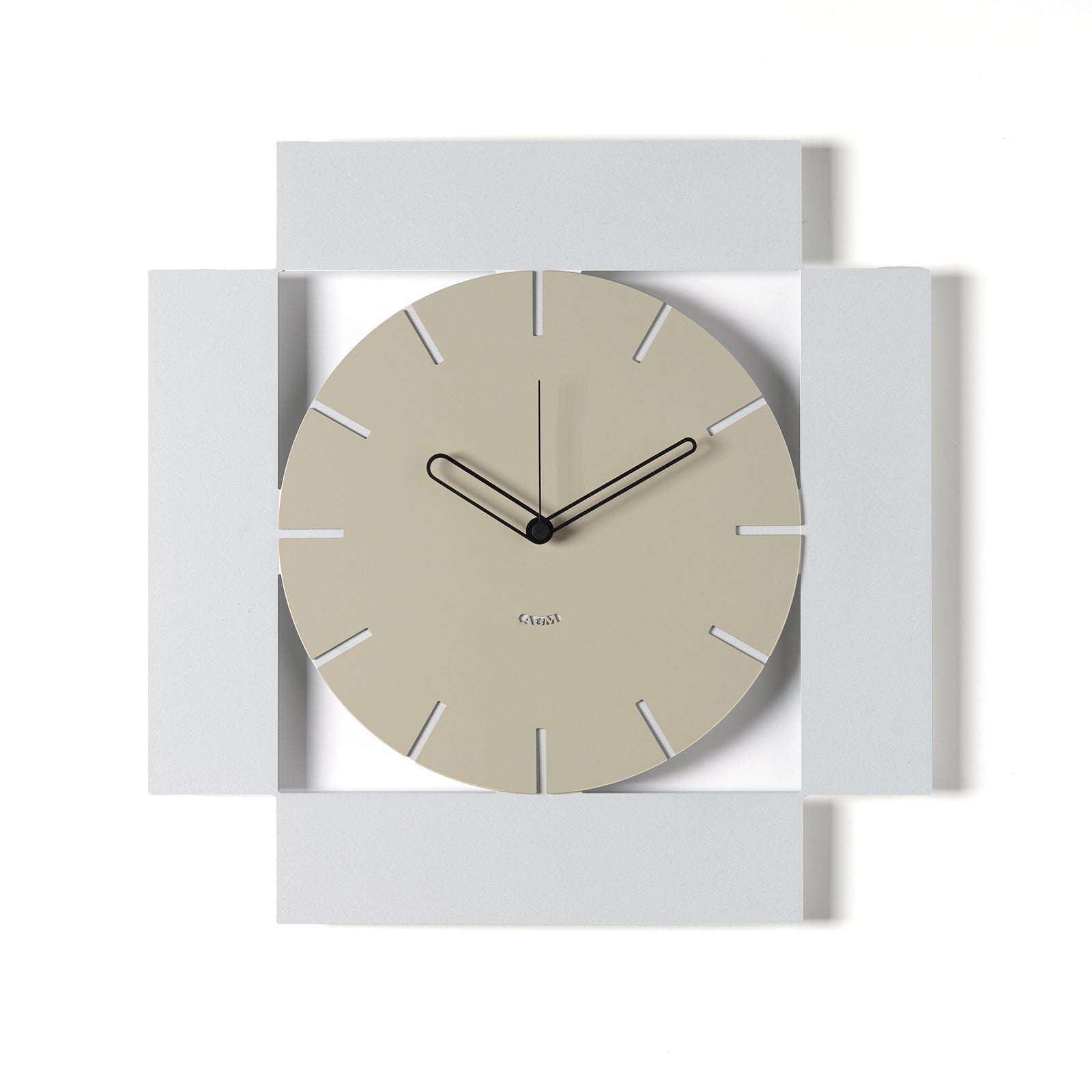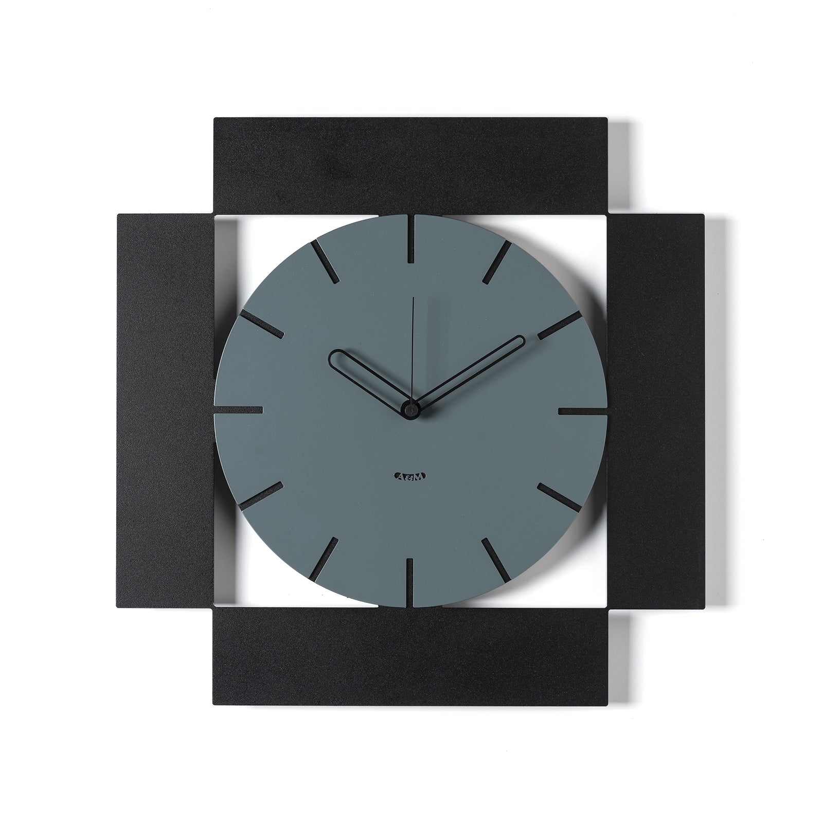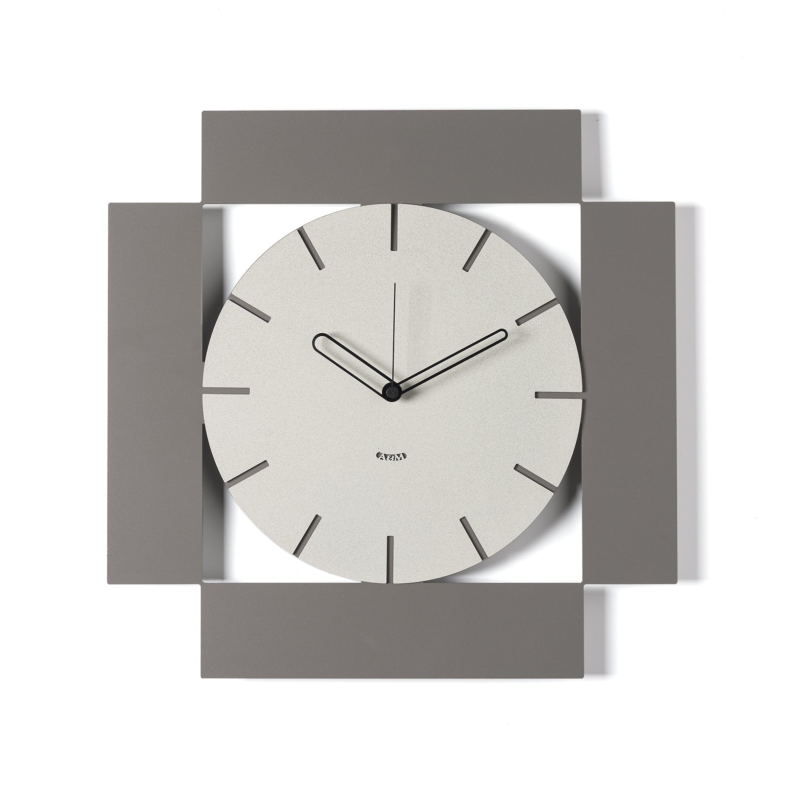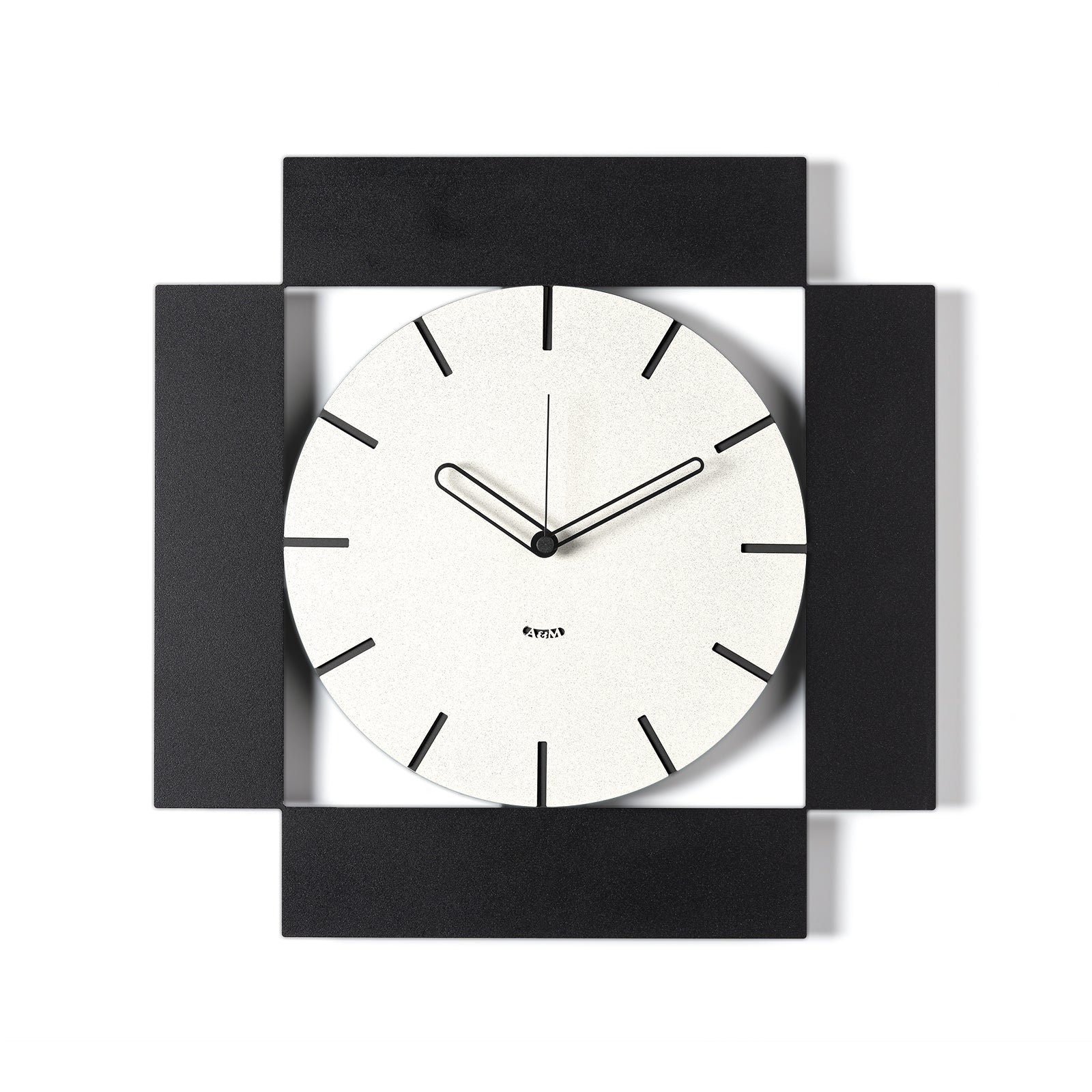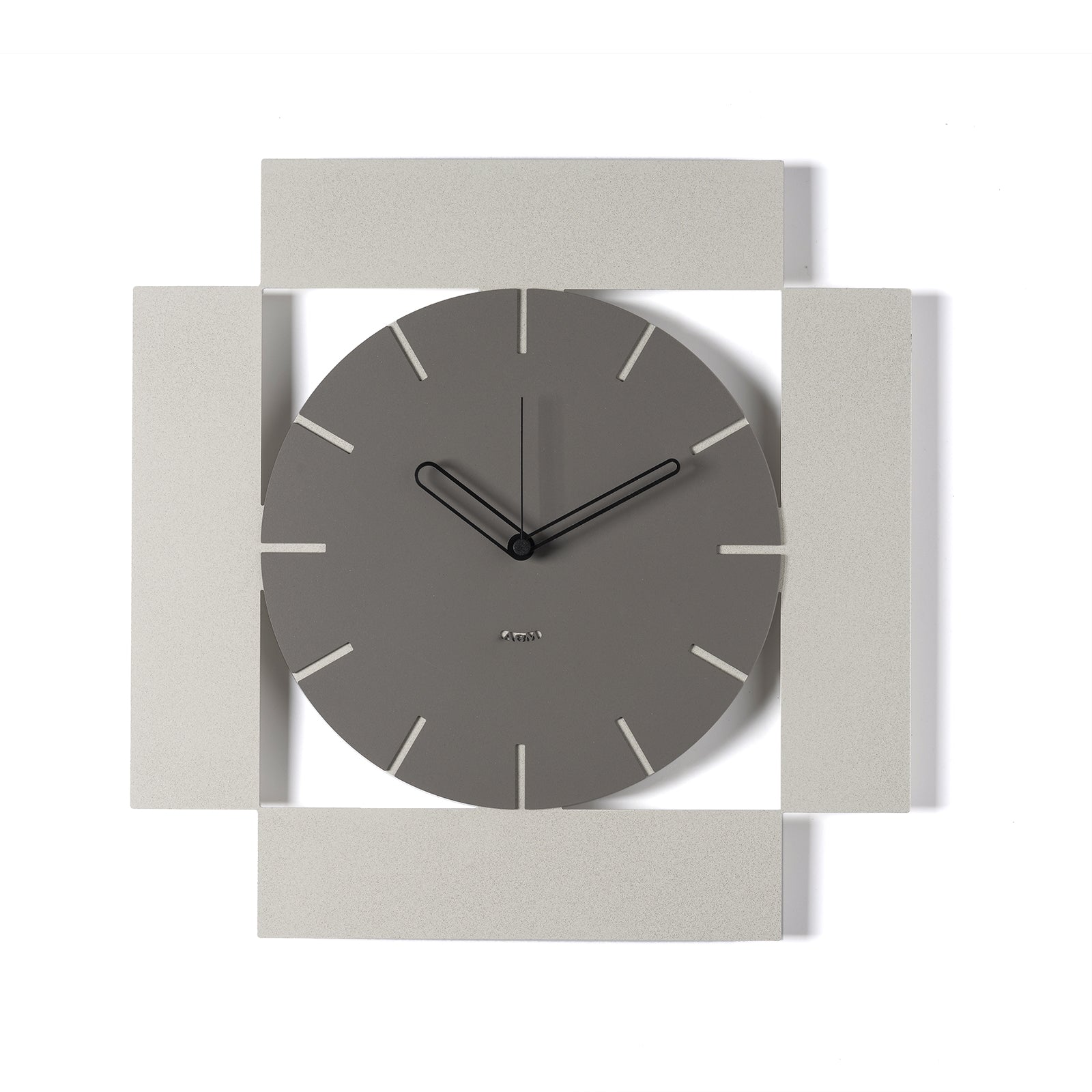 Al centro della composizione si trova un quadrante rotondo, essenziale e ben leggibile, segnato da linee sottili che indicano il passare delle ore. Ciò che rende Radical davvero unico è la struttura che lo circonda: quattro rettangoli disposti in modo speculare sui lati del quadrante, come a incastonarlo, andando a formare una cornice quadrata perfettamente simmetrica. Questo gioco visivo tra forme crea un effetto dinamico ma al tempo stesso ordinato, ideale per ambienti moderni ed eleganti.