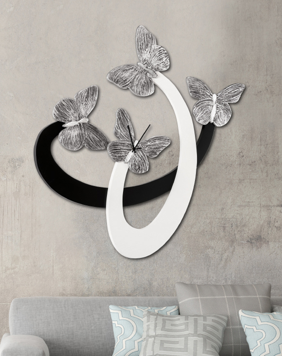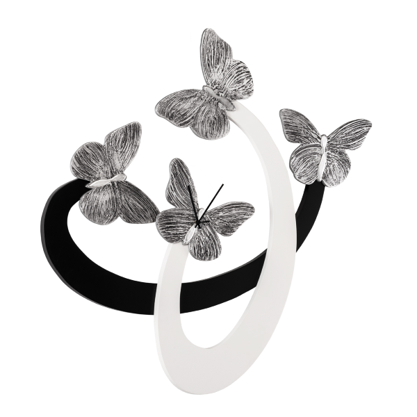 Orologio con eleganti farfalle in foglia argento, unite da un gioco di originali fasce avorio e nero.
