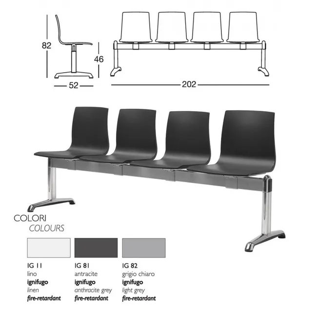 La seduta è disponibile nelle versioni a 3, 4 o 5 posti, con scocche realizzate in tecnopolimero ignifugo, offrendo sicurezza e durabilità.
