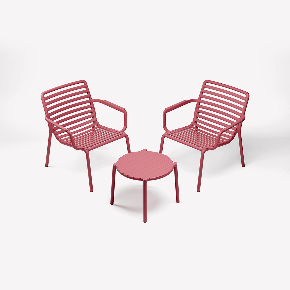Rilassante ampia poltroncina ribassata per l’esterno in resina fiberglass contraddistinta da un gioco di pieni e di vuoti scanditi da una sequenza di doghe orizzontali. Impilabile, facilmente igienizzabile e riciclabile.