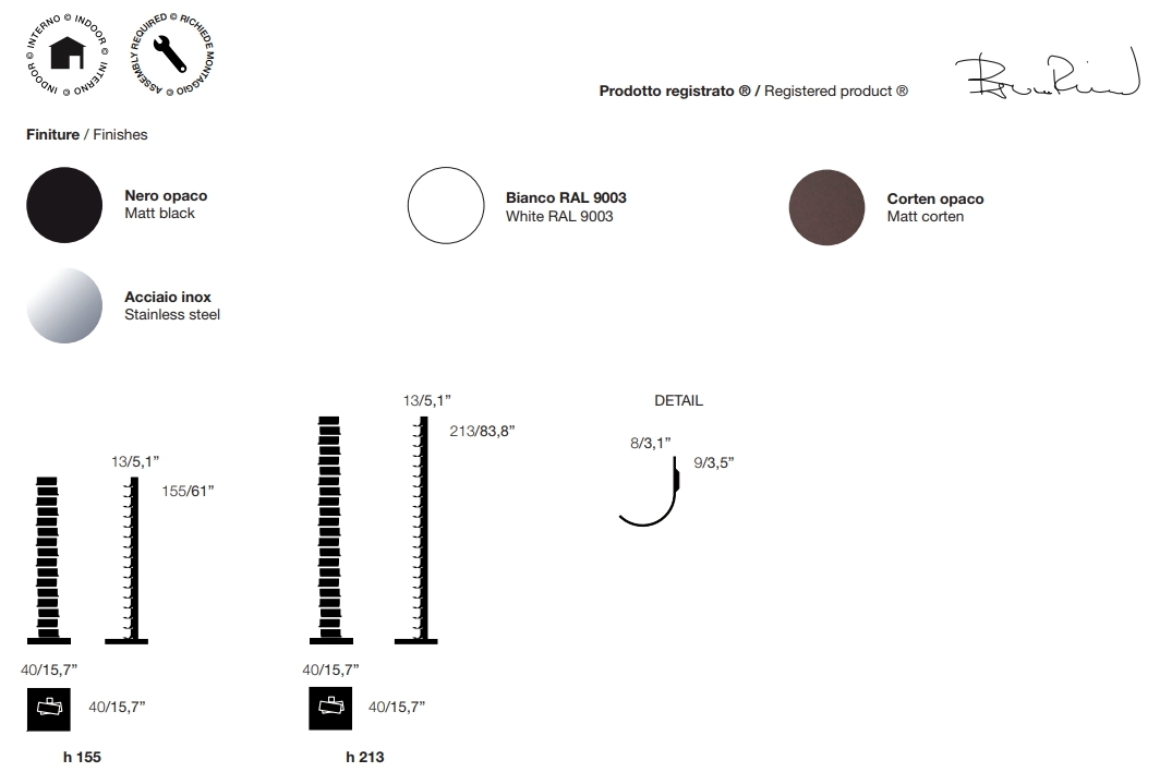 Finiture base: laccato nero ed effetto corten opaco, bianco lucido laccato RAL 9003, acciaio inox mirror.