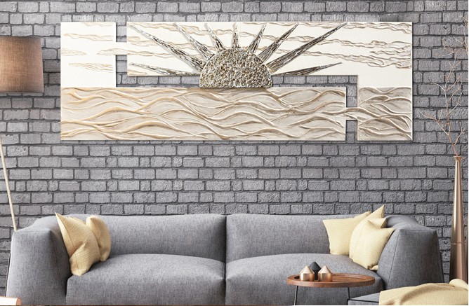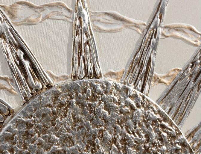 Struttura a doppia elle decorata a mano con dettagli in resina su materico con elemento centrale a rilievo.
