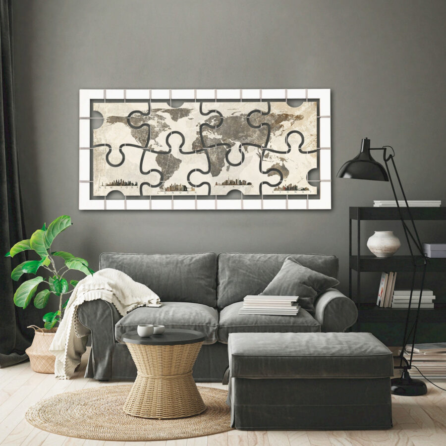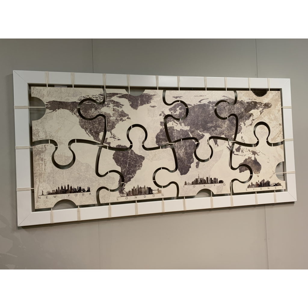 Cornice in legno laccata avorio con otto pannelli sospesi su corde.