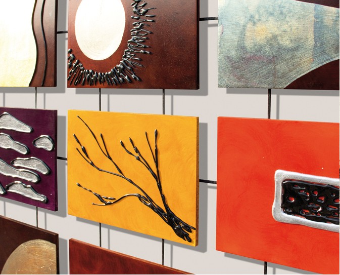 Cornice in legno laccata caffè con quindici pannelli sospesi su corde, decorati a mano con foglia oro, argento e piombo, dettagli in rilievo.