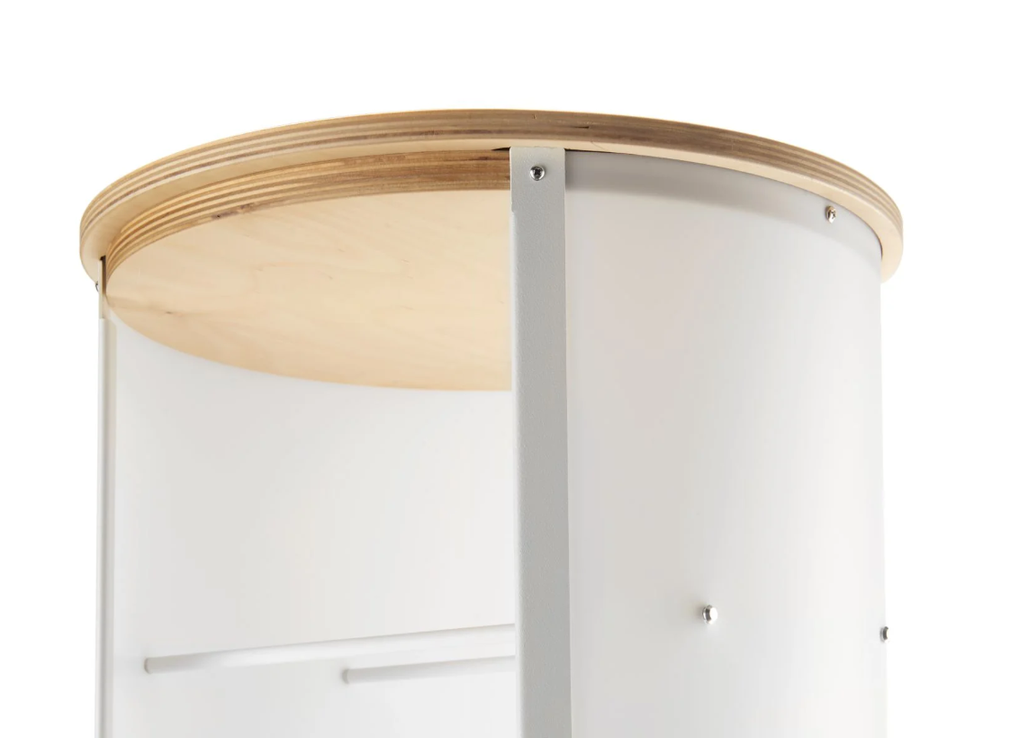 Base e top disponibile in versione metallo verniciato grigio, bianco o legno naturale.