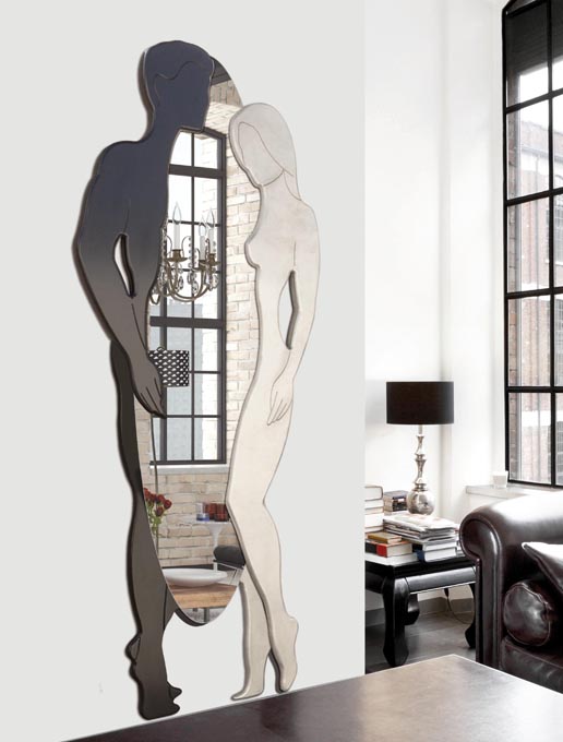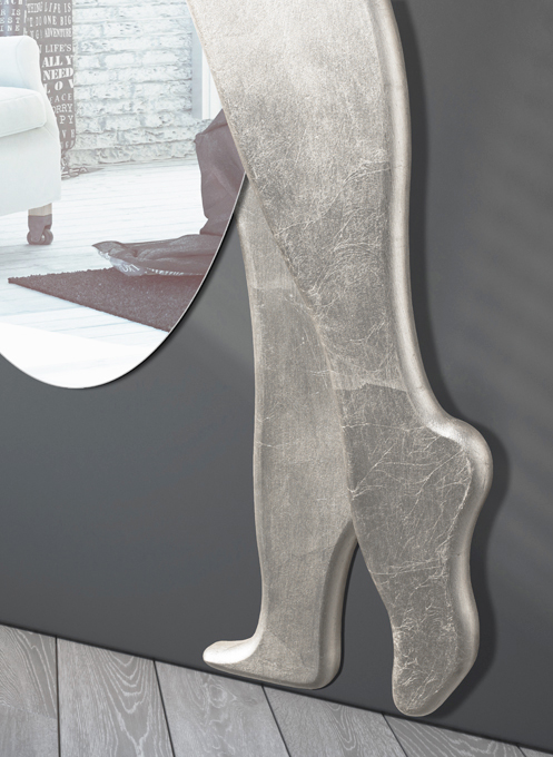 Formad spegel, lackerad i kaffefärg, handdekorerad i bladsilver.