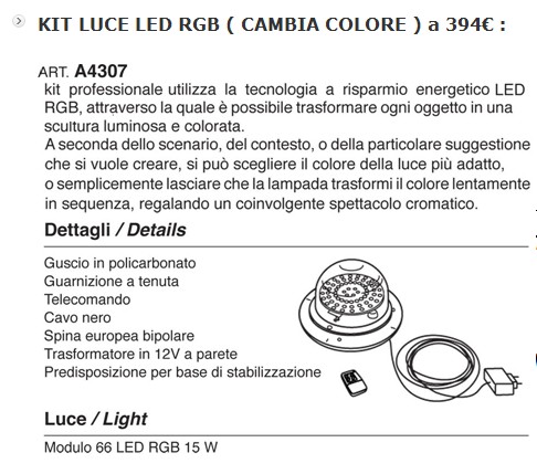 Produkten kan utrustas med ett utomhusbelysningskit eller ett RGB-belysningskit; det senare, tack vare sitt variabla färgomfång, skapar kromatiska effekter med en stark känslomässig effekt. (BELYSNINGSKIT KAN KÖPS SEPARAT; SE KODERNA A4182 OCH A4307)