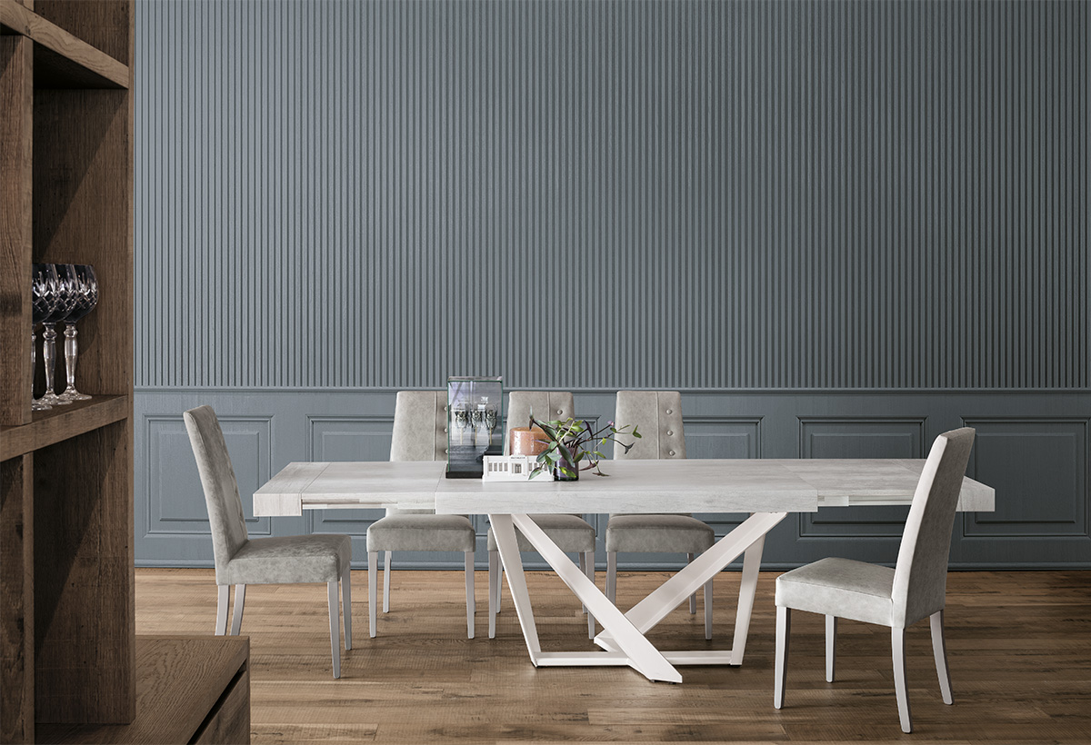 Den laminerade träskivan, med en hög kant som förstärker dess robusthet och elegans, åtföljs av sidoförlängningar i samma finish, vilket gör att du enkelt kan förlänga bordsytan samtidigt som du bibehåller ett enhetligt utseende.