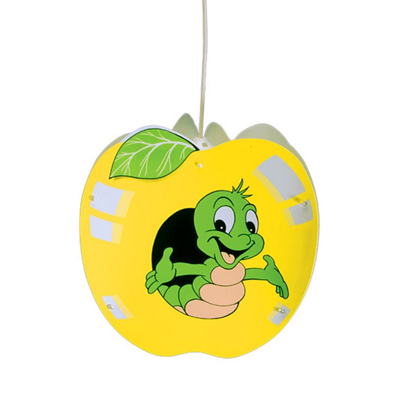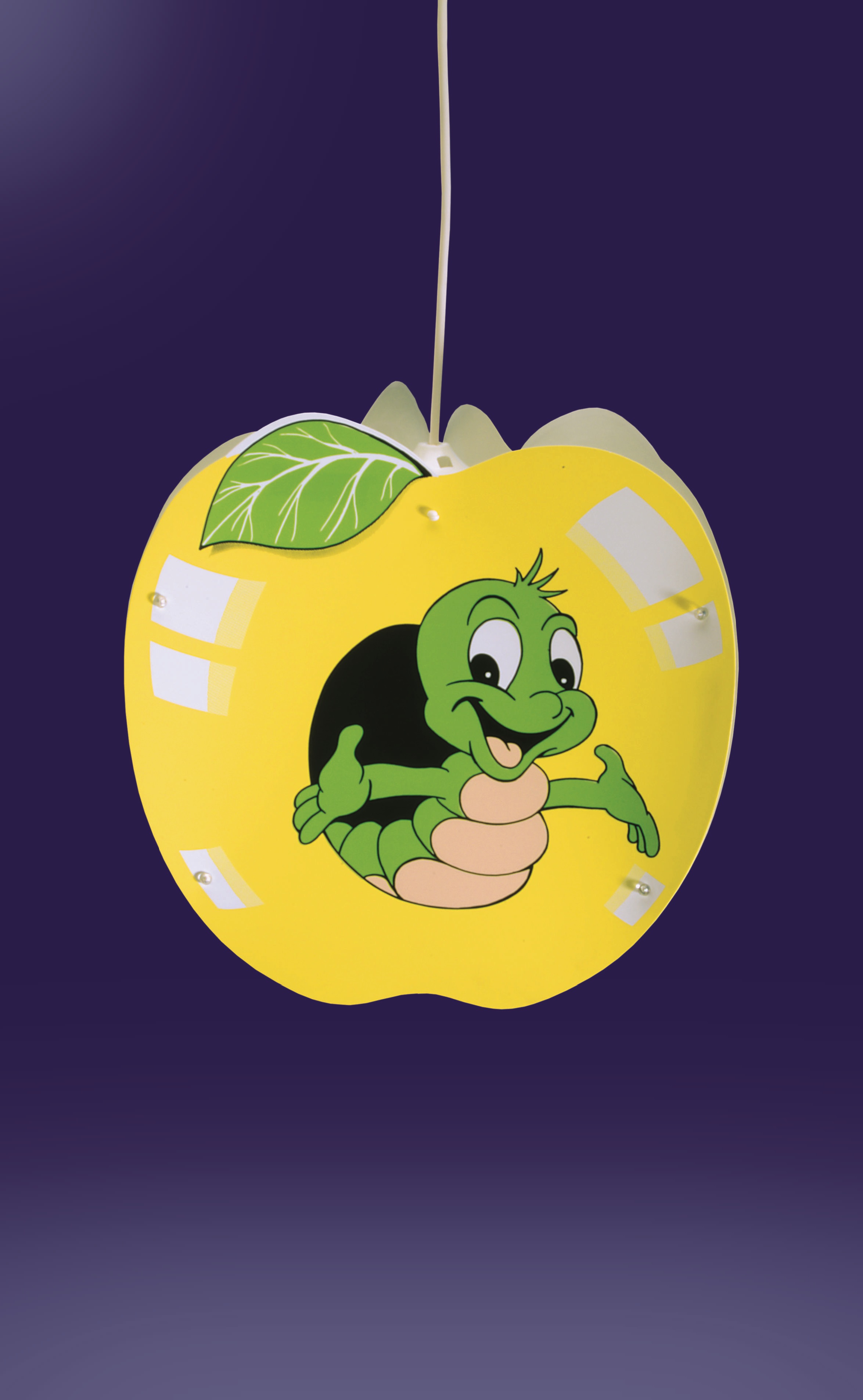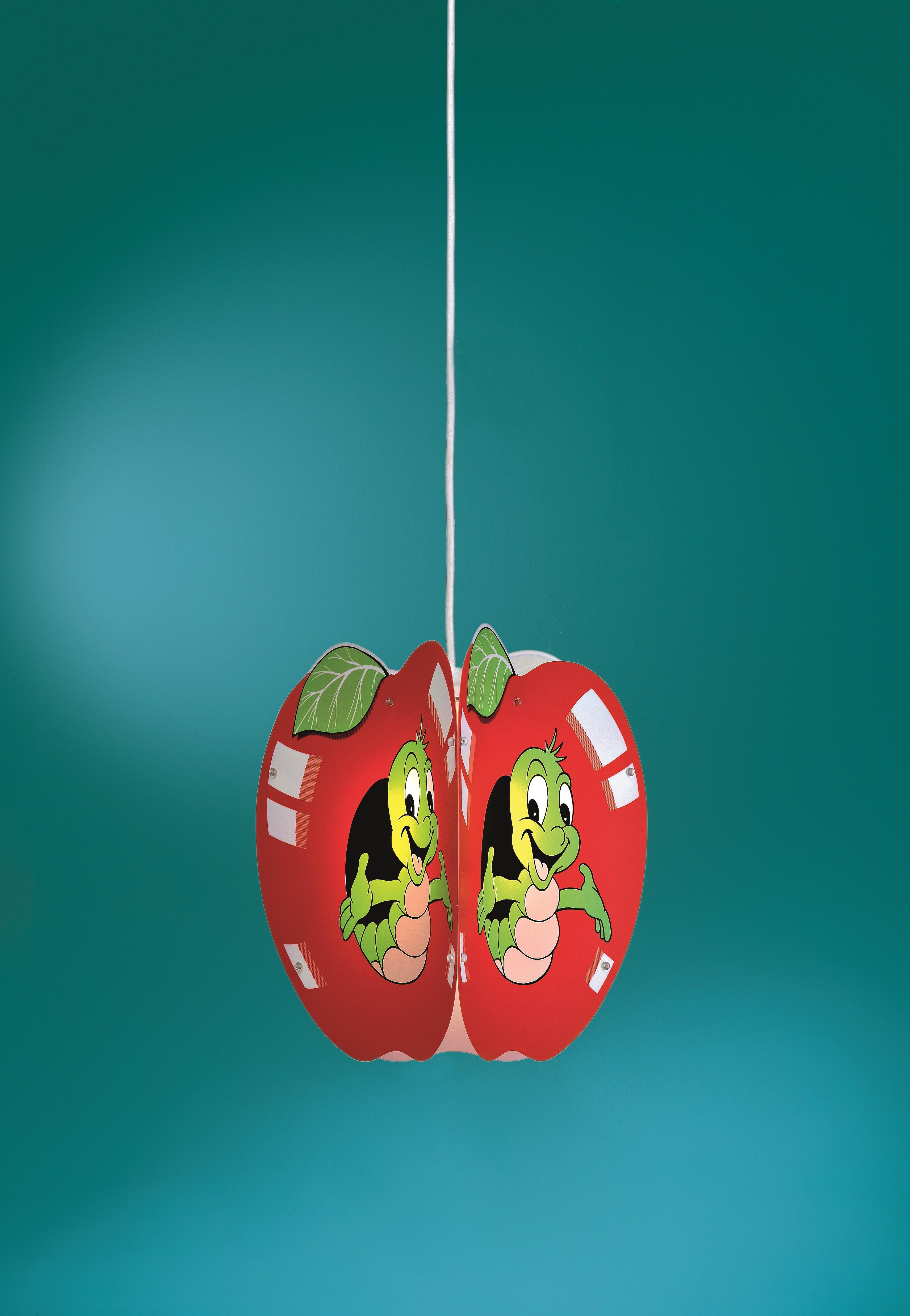Trevligt sällskap, med det vakande ögat av en vänlig larv som bor i ett färgglatt äpple. Grönt, vitt och klarrött är färgerna för glädje.