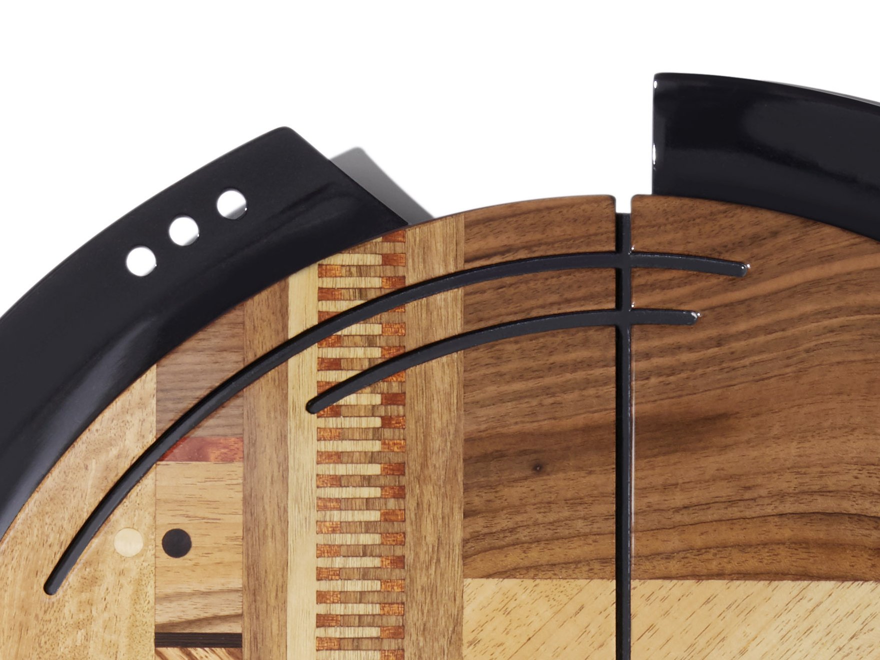 Utsidan är inlagd med olika fina träslag, såsom almknäppa, rosenträ, röd bobinga, italiensk valnöt, zebrano och valnötsknäppa. Ytfinishen är en strålande glans. Interiören är gjord av trämassa.