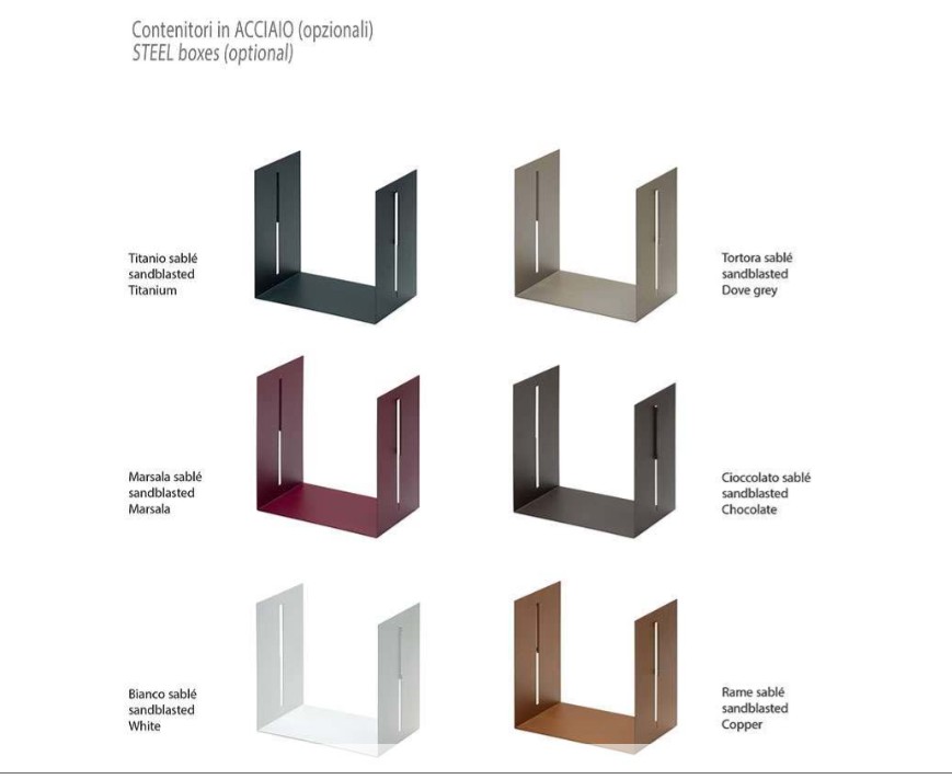 Konstruktionerna kan kompletteras med valfria containrar, tillverkade av 1,5 mm tjock stålplåt målad med sandblästrad yta eller 12 mm tjockt miljövänligt laminat.