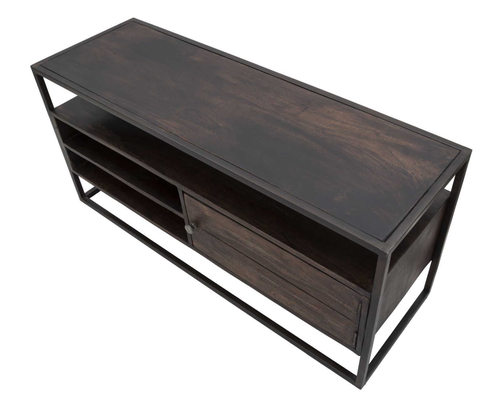 TV-bänk i massivt akaciaträ med 3 hyllor och en dörr inramad i en svart metallstruktur med rena, fyrkantiga linjer som ger en touch av modernitet till ett extremt elegant och klassiskt möbel.