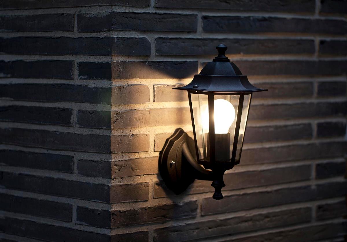 Utomhusvägglampa, tillverkad av metall och glas.