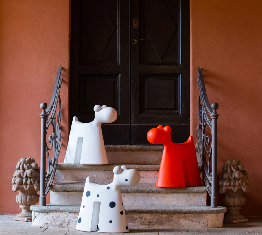I århundraden har hundar haft en plats i hemmen som pälsklingar eller väktare. Doggy hittar också en plats bland möbler: ett designföremål, en trädgårdsdekoration, en barnleksak eller en pall tack vare sin robusta struktur. Placerad vid entrén spelar den rollen som en välkomnande väktare som välkomnar gäster.