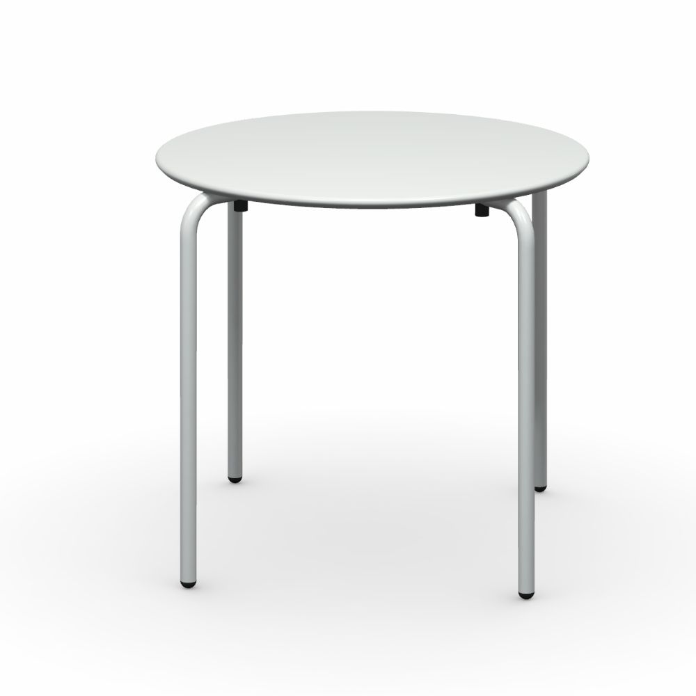 Bordstommen är tillverkad av metallrör, medan skivan är tillverkad av formad plåt.