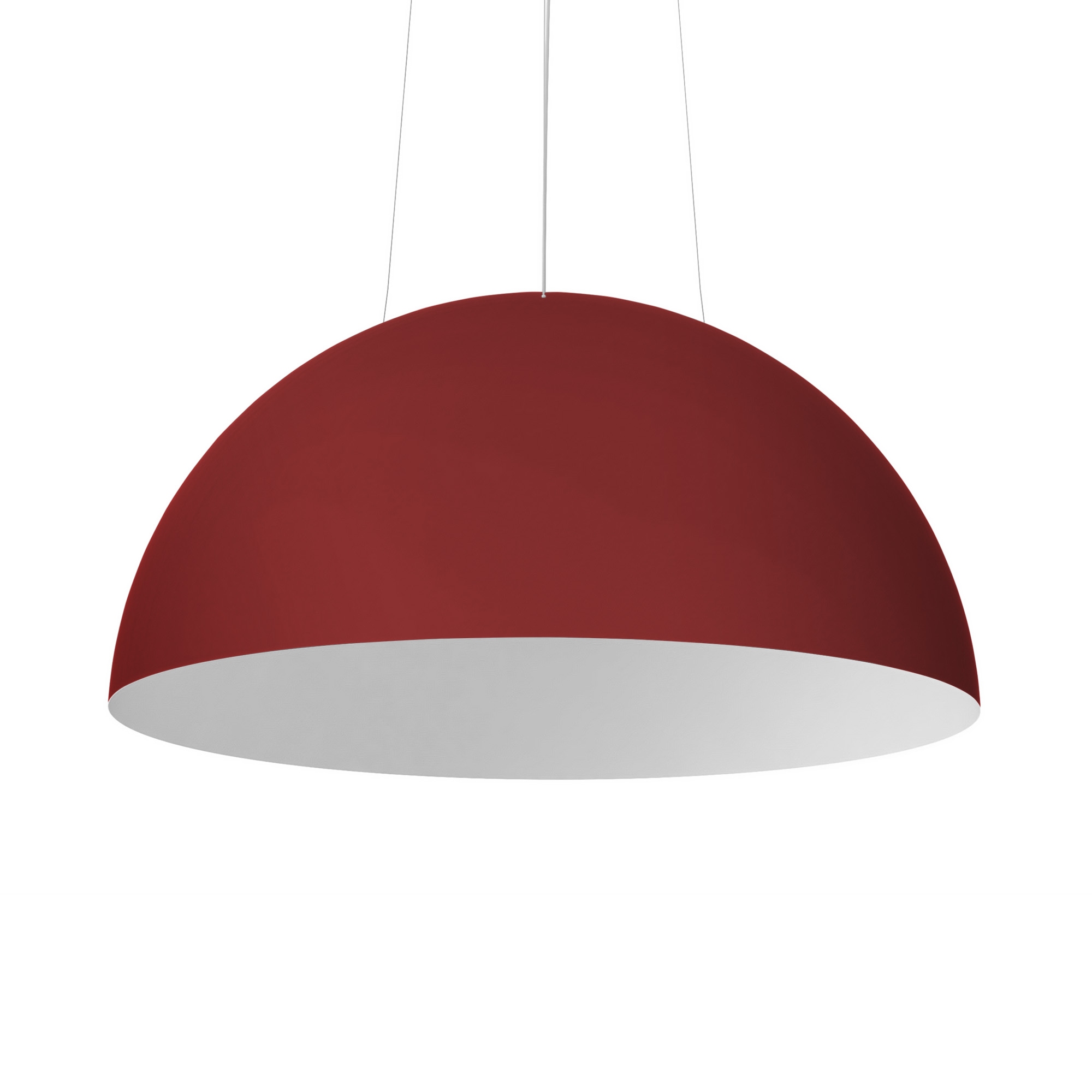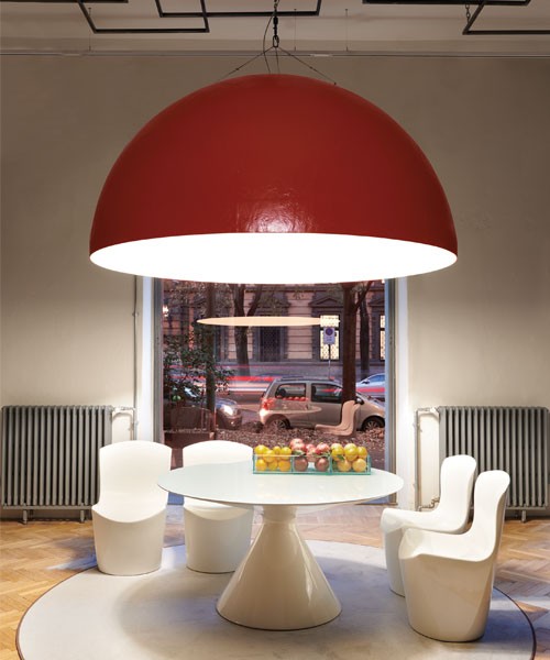 Elios är en lätt, modern pendellampa med en klassisk kupolformad finish. Tillverkad av glasfiber har den en smal silhuett och finns i tre olika diametrar och färger: röd, beige och blå. Dessa djärva exteriörfärger skapar en vacker kontrast till den varma, klara vita nyansen i interiören, vilket skapar vackra ljusspel i alla kommersiella eller bostadsmiljöer.