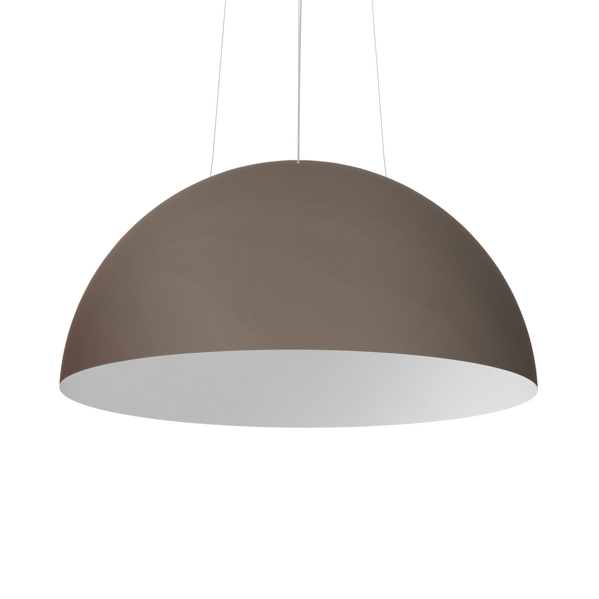 Pendellampa i glasfiber tillverkad med en speciell tvåfärgad lack. Takrosett i vit metall och tre metallkablar ingår. Vit elkabel. Designad för en glödlampa.