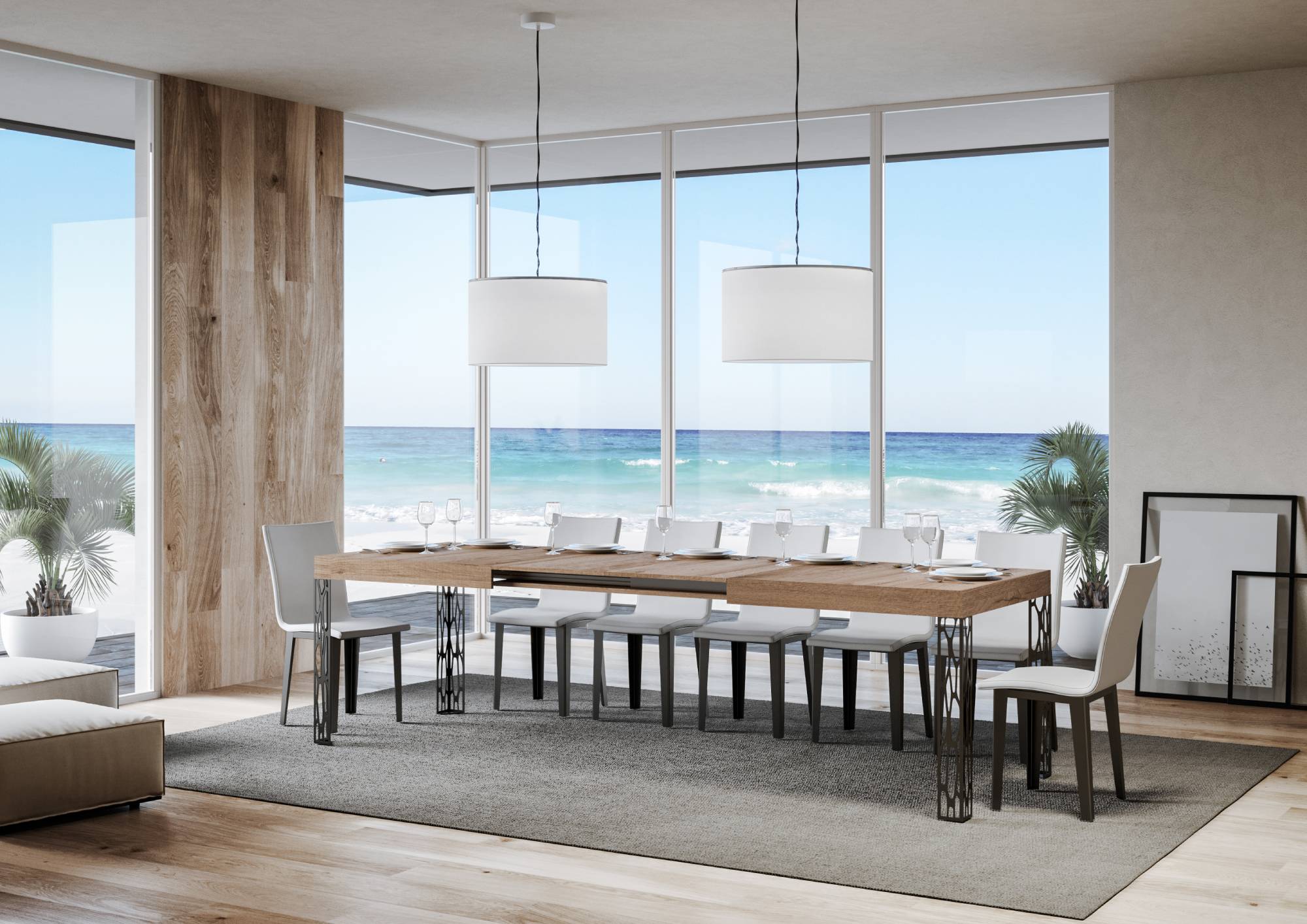 Det 180 cm stora utdragbara Ghibli-bordet, med sin eleganta och unika design, anpassar sig till alla inredningar och är det perfekta valet både som matbord och som en inredningsmöbel i vardagsrummet, där du kan välkomna gäster med stil. Det utdragbara Ghibli-bordet kan gradvis förlängas upp till 284 cm och har plats för 12 personer. Tillverkat med melaminpaneler, järnben och en fällbar bordsskiva. Förlängningssystemet med teleskopskenor i aluminium gör bordet stabilt och robust även när det är helt utfällt, utan behov av ytterligare stöd. Förlängningsskivorna är omedelbart redo att användas eftersom de är placerade under huvudbordsskivan. Itamoby-produkt Tillverkad i Italien Mått: Stängt bord: B 180 D 90 H 77 cm Längd med 1 förlängning: 232 cm Längd med 2 förlängningar: 284 cm