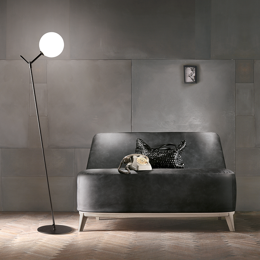 Golvlampa med svart metallstruktur och vit lampskärm med sfär.