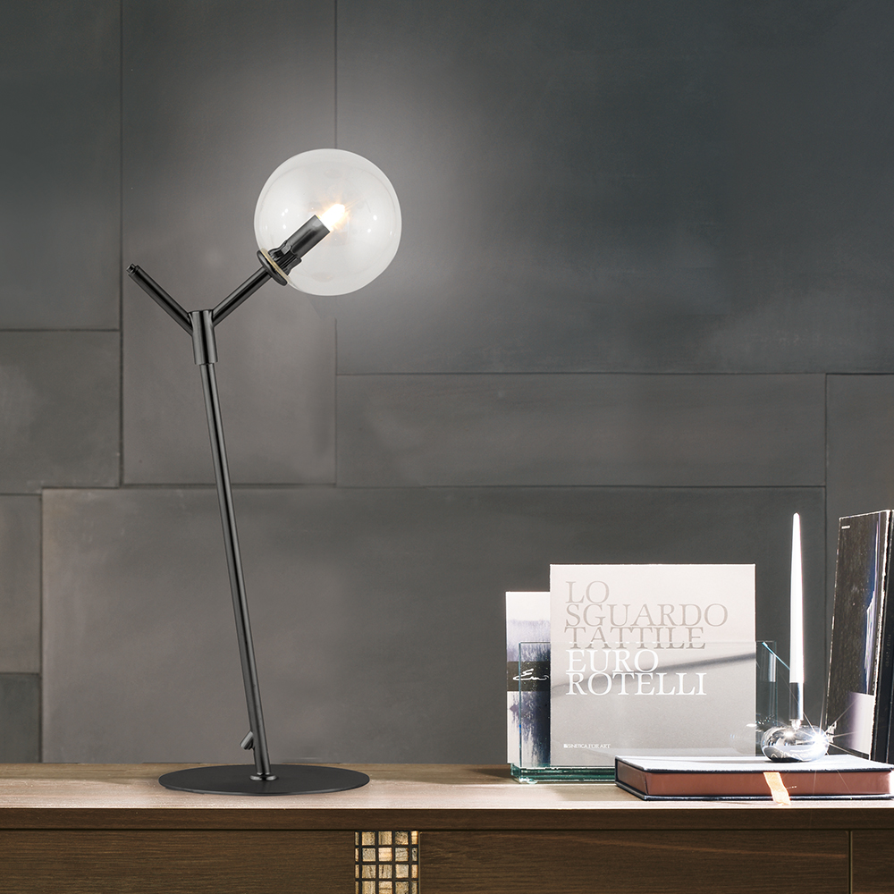 Bordlampa i metallstruktur med vitt sfäriskt lampskydd.