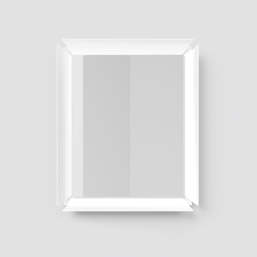Väggspegel med mattlackerad aluminiumram, fäst på en färgad laminatbas.