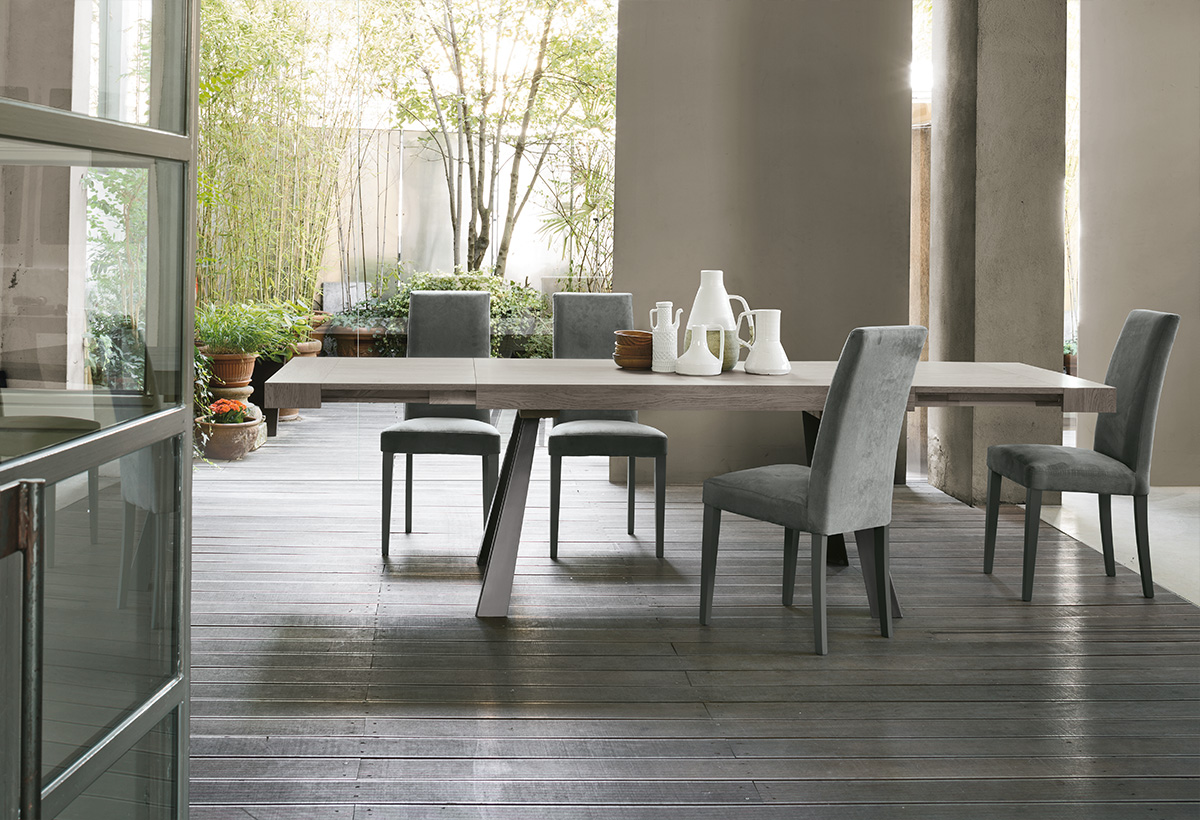 Det utdragbara bordet Grecale är en elegant möbel med en målad eller borstad metallram, med en laminerad skiva och sidoförlängningar.