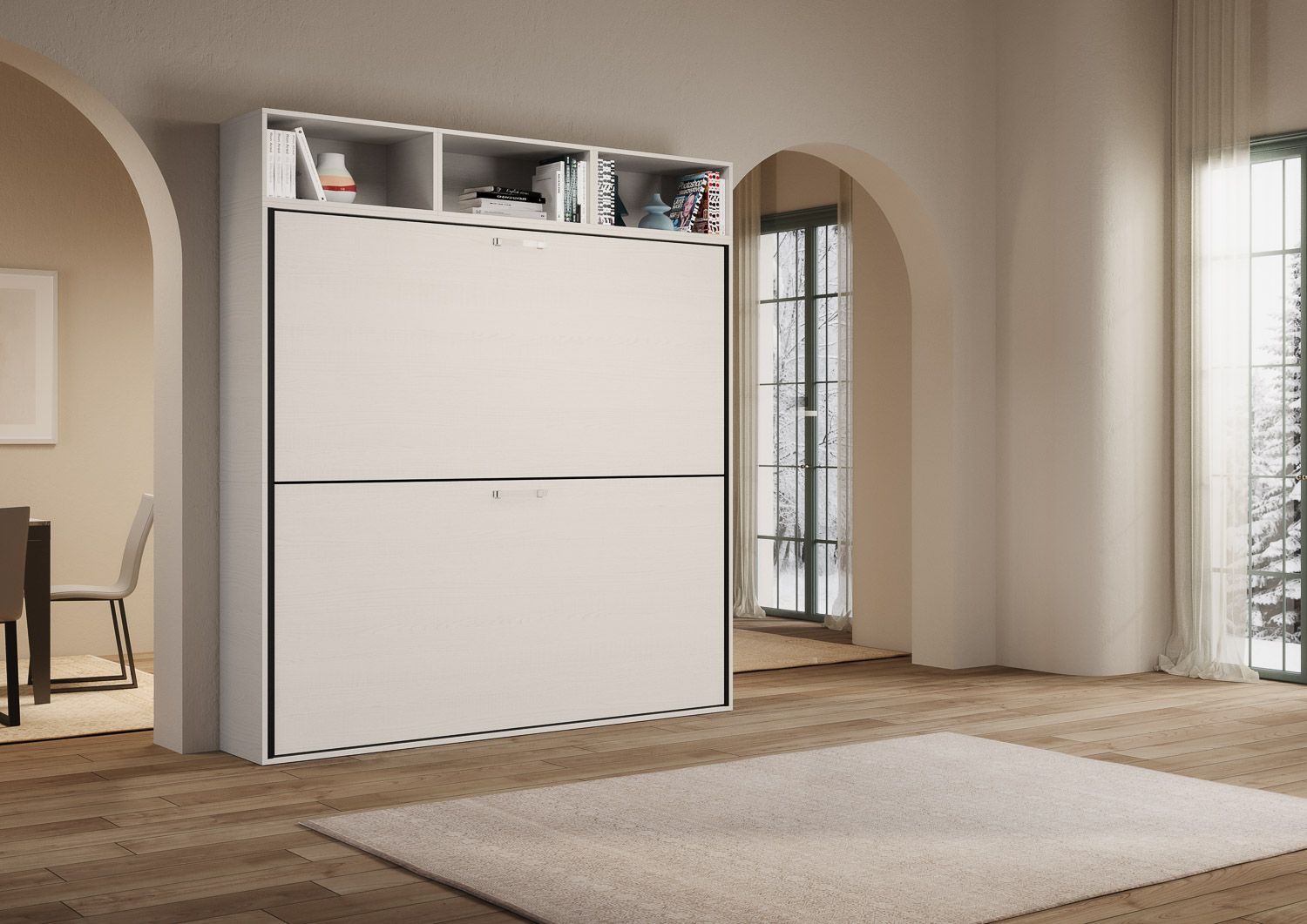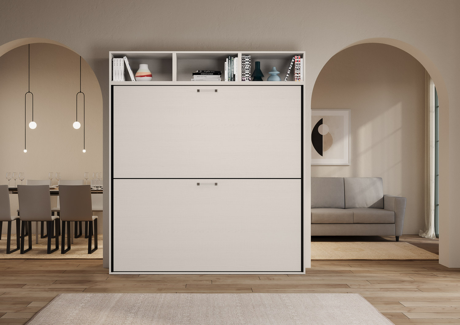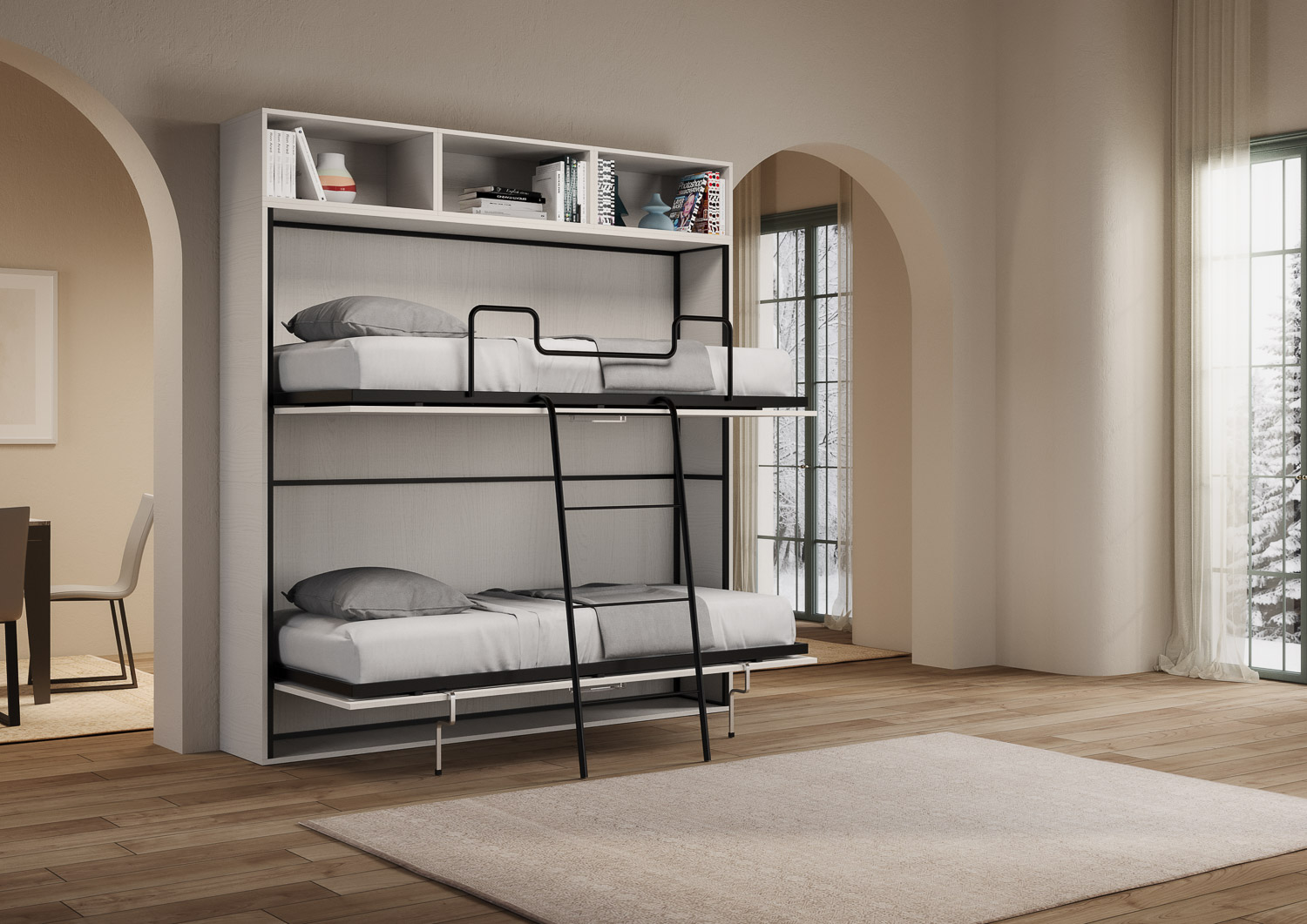 | Material | Kando L är en dubbelsäng med tre öppna förvaringsfack. Denna originella och funktionella lösning optimerar tillgängligt utrymme och tar endast upp 39,2 cm djup när den är stängd. Kando L eller |