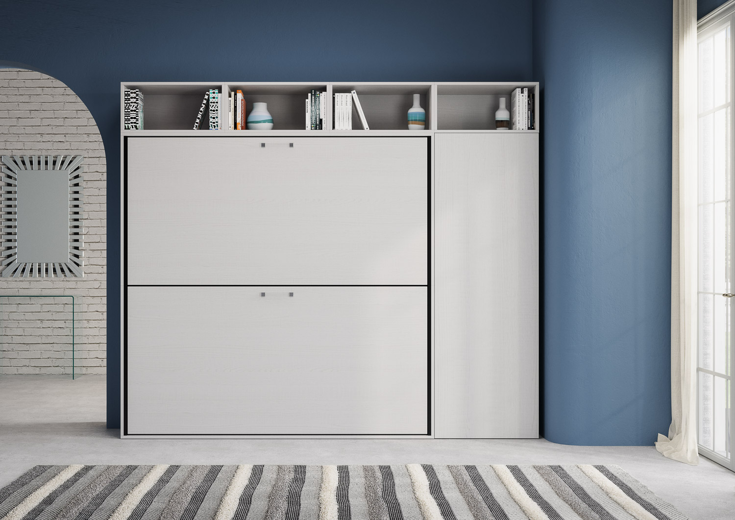 | Material | Kando I är en vägghängd dubbelsäng med en liten men rymlig garderob med en dörr och fyra öppna fack. Detta är en originell och funktionell lösning som optimerar det tillgängliga utrymmet och tar endast upp 39,2 cm djup när den är nedfälld. |