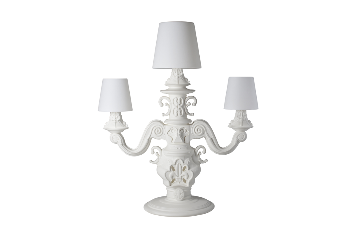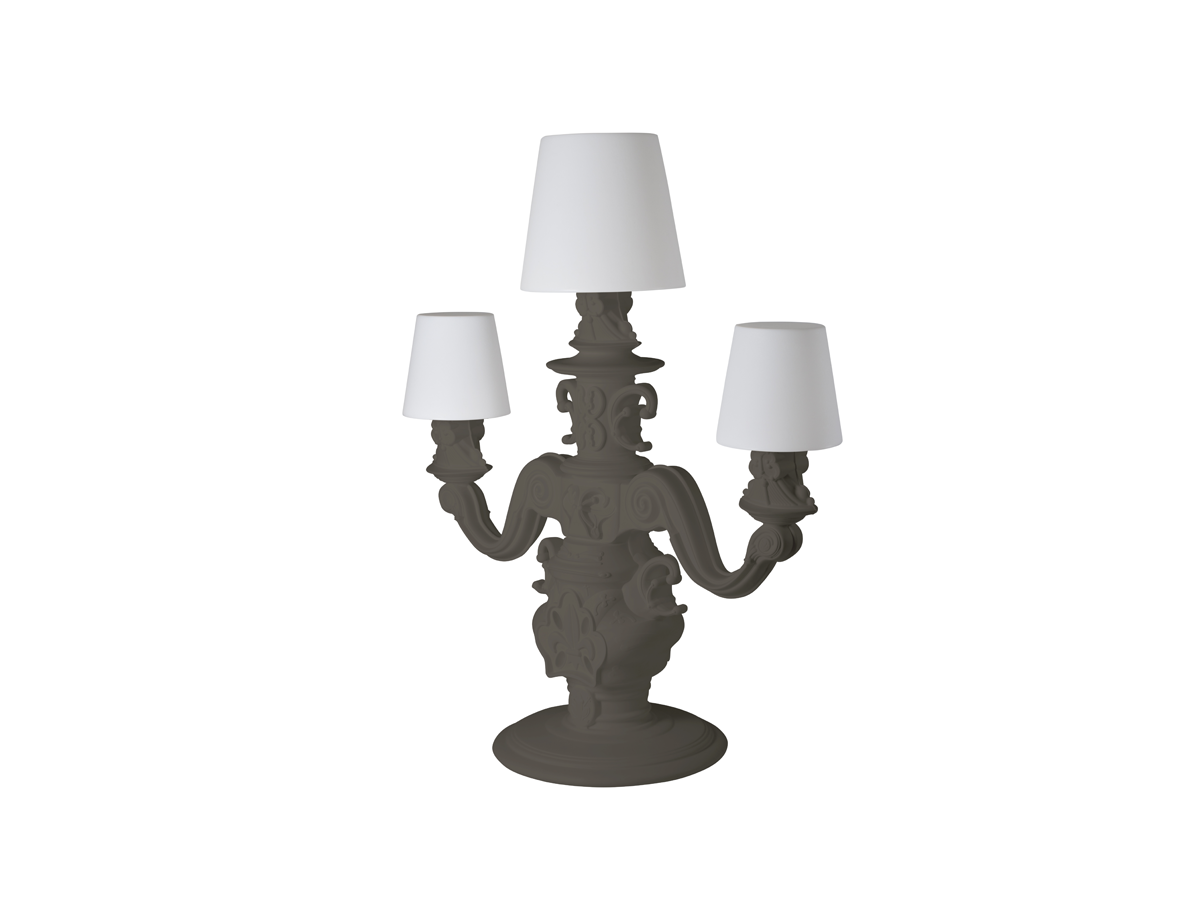 Golvlampan King of Love, designad av Graziano Moro och Renato Pigatti, är en del av Design of Love-kollektionen. Lampfoten är i barockstil, medan de tre stora, lysande vita lampskärmarna är majestätiska i skala och har en innovativ detalj: polyetenen är behandlad med en unik ytfinish med ett texturerat klassiskt motiv, för en raffinerad, elegant och taktil dekoration.