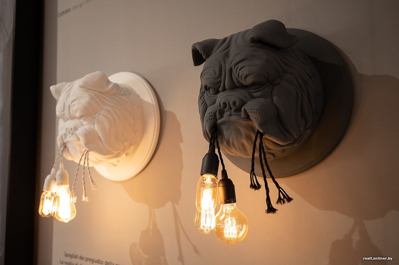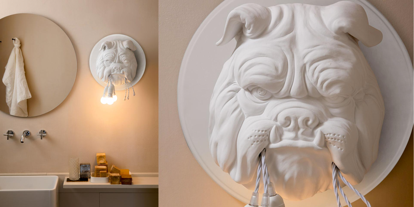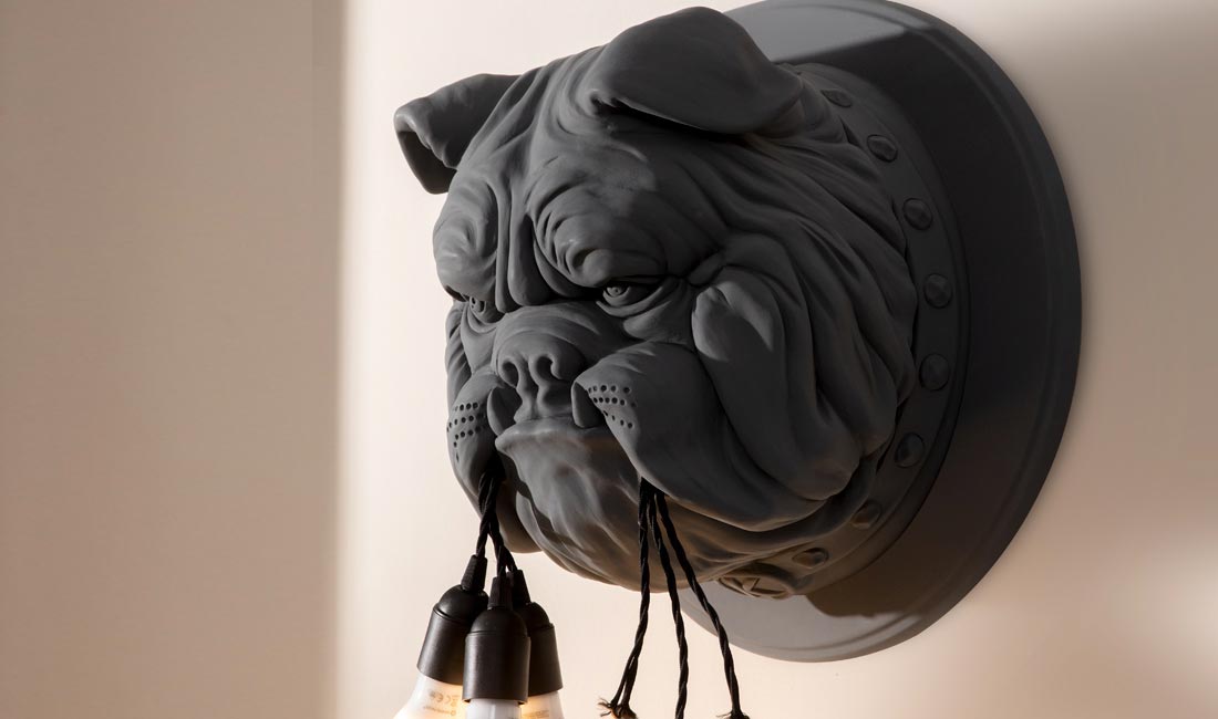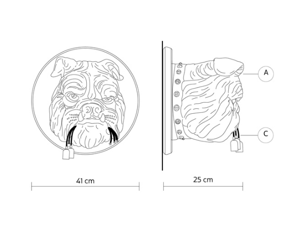 Amsterdam, tillverkad av keramik, är en vägglampa skulpterad i relief för att föreställa ett slående realistiskt, överdimensionerat bulldogghuvud. Djuret håller tre LED-lampor i munnen, som om det just hade slitit ut dem efter ett skrämmande raseriutbrott! Rolig och provokativ, denna vägglampa dekorerar din vägg på ett ovanligt sätt och skapar en både drömlik och fantastisk värld, med ett mjukt, omgivande ljus. Endast LED-lampor i plast (max 10W E27) är tillåtna, ingår ej.
