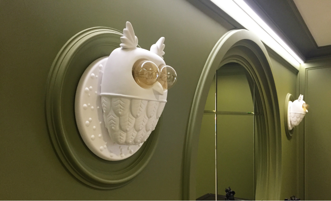 Ti-Vedo, tillverkad av keramik, är en vägglampa skulpterad i relief för att föreställa en söt och lekfull uggla, med två glödlampor som representerar fågelns ögon som kikar in i mörkret. Ironiskt nog, i linje med Karman-stilen, dekorerar denna vägglampa väggen på ett ovanligt sätt, skapar en fantasivärld och sprider ett mjukt omgivande ljus. Utrustad med två E27-lamphållare kan du använda 53W dekorativa glödlampor (ingår ej), men vi rekommenderar att du använder LED-glödlampor.