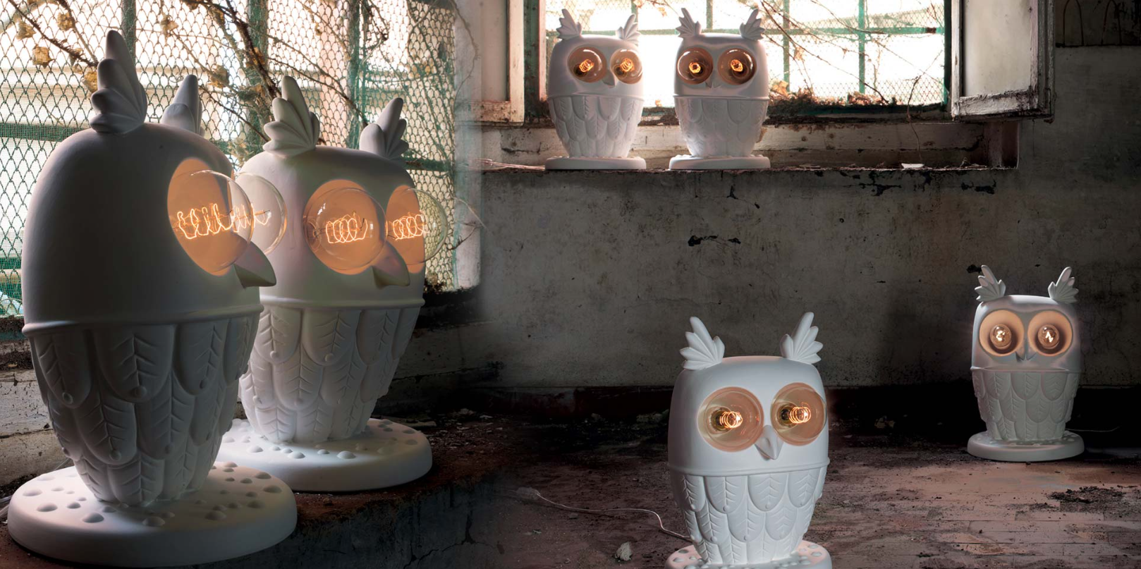 Ti-Vedo, tillverkad av keramik, är en bordslampa skulpterad i relief för att föreställa en söt och rolig uggla, med två glödlampor som avbildar fågelns ögon som kikar in i mörkret.