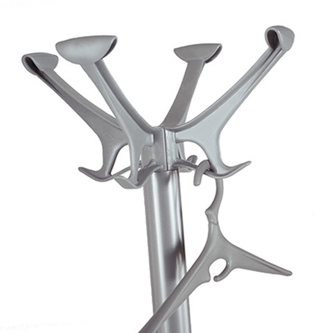 Golvstående klädhylla bestående av en bas av djupdraget stål med rundade kanter för att förhindra skador på golvytan, målad med silvergrå epoxipulver.