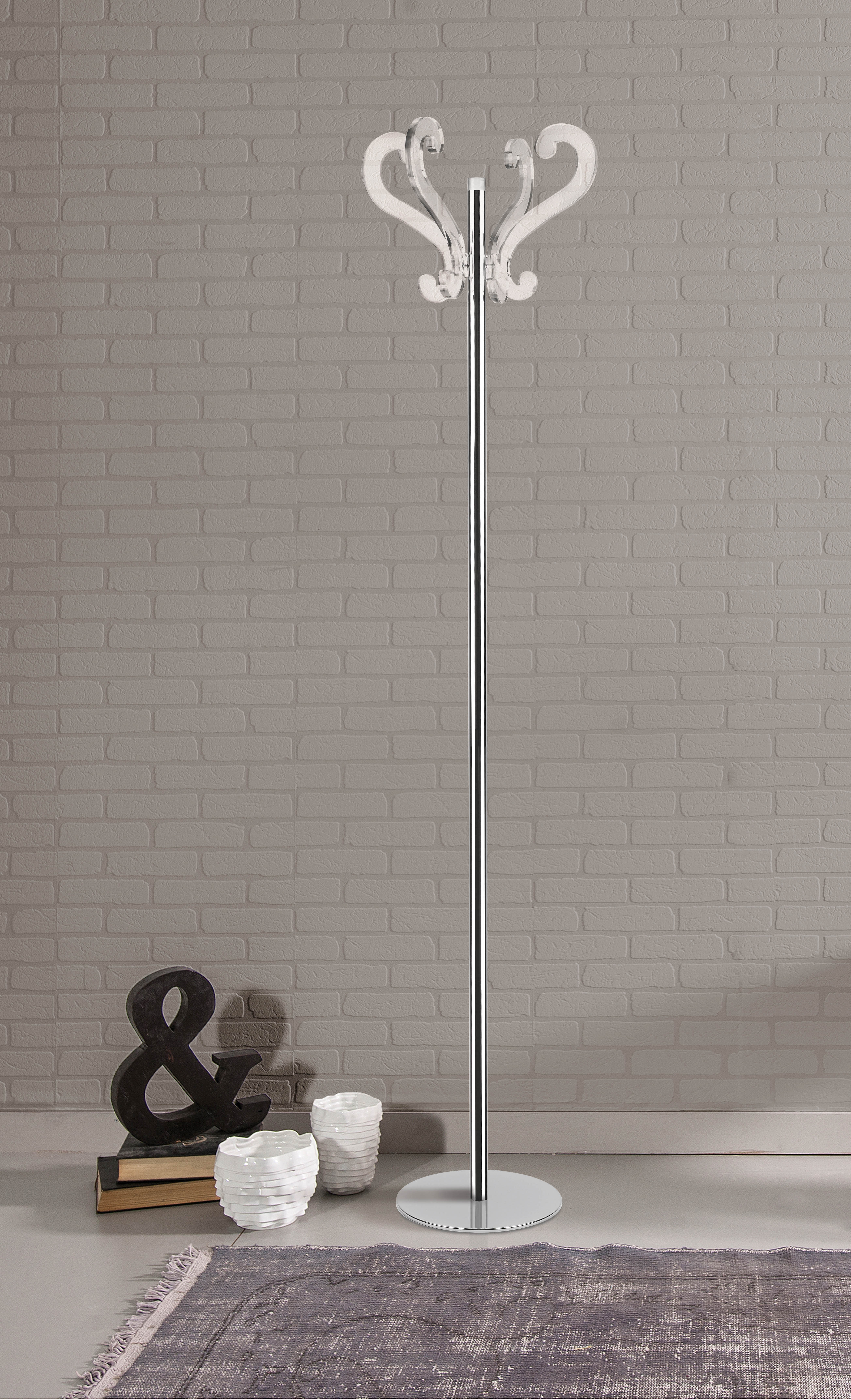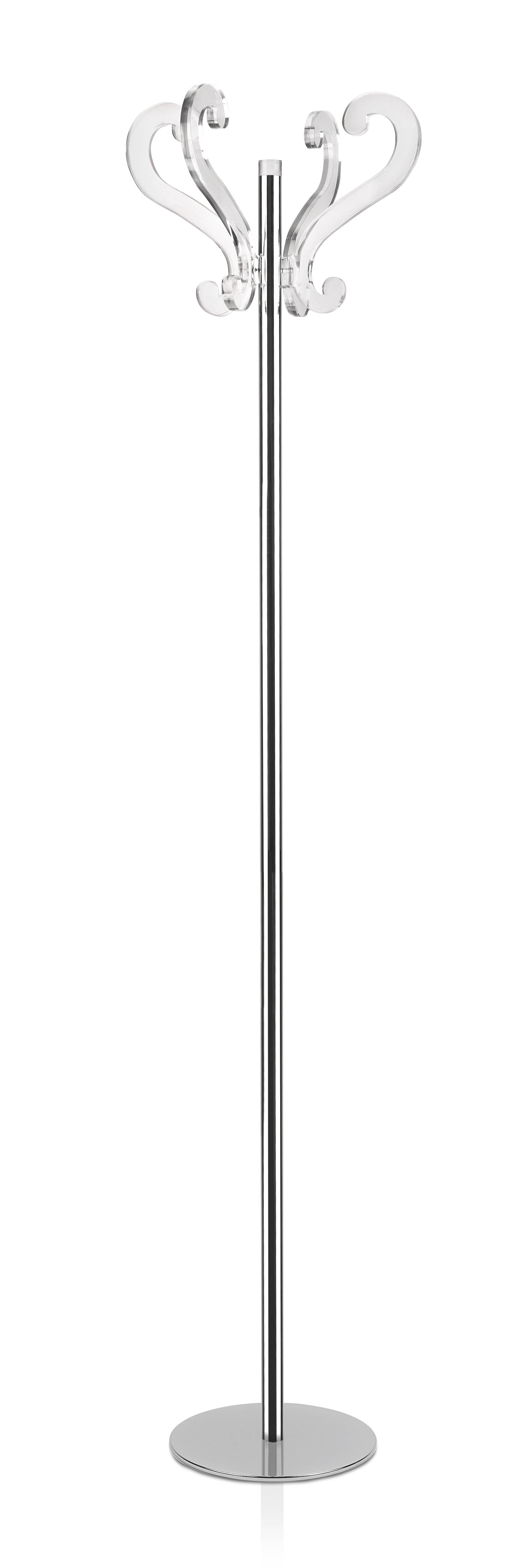 Klädhängare i transparent akrylkristall med stålstruktur.
