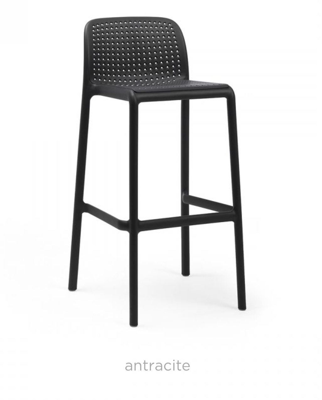 En pall i ett stycke med glasfiberharts för utomhusbruk, med ett perforerat mönster över sits och ryggstöd som påminner om den mjuka tygstoppningen. Sömlös rörformad struktur och generösa mått. Lätt och stapelbar.