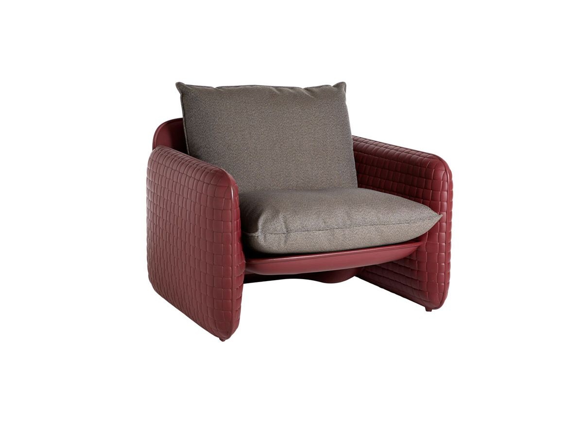 Det vävda lädret fortsätter genom hela Mara-loungefåtöljen, designad av Lorenza Bozzoli. Den unika texturen kombineras med vattentäta tygkuddar och är lämplig för utomhusbruk. Den bekväma sitsen gör Mara idealisk för tak-, trädgårds- och inredningsprojekt. Mara-kollektionen inkluderar även Mara tvåsitssoffan och Mara Pouf-ottomanen. Mått cm 106 x 94 h 82 - sits H 52