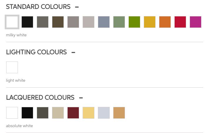 - Standard: vit, svart, elefantgrå, brun, lergrå, duvgrå, blå, salviagrön, limegrön, gul, orange, röd, fuchsia