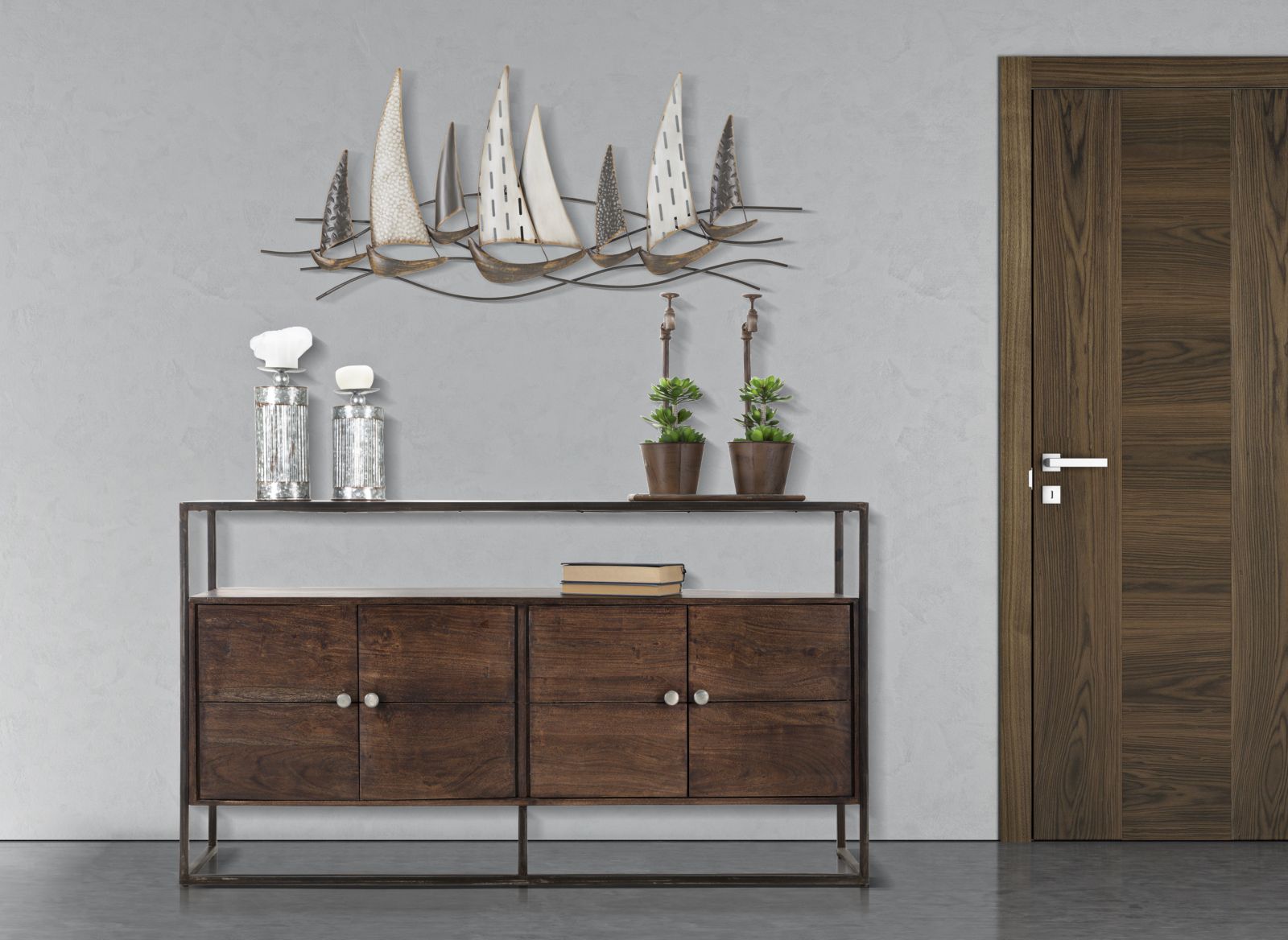 Skåp i massivt akaciaträ med hyllplan och fyra dörrar inramade i en svart metallstruktur med rena, fyrkantiga linjer som ger en touch av modernitet till ett extremt elegant och klassiskt möbel.