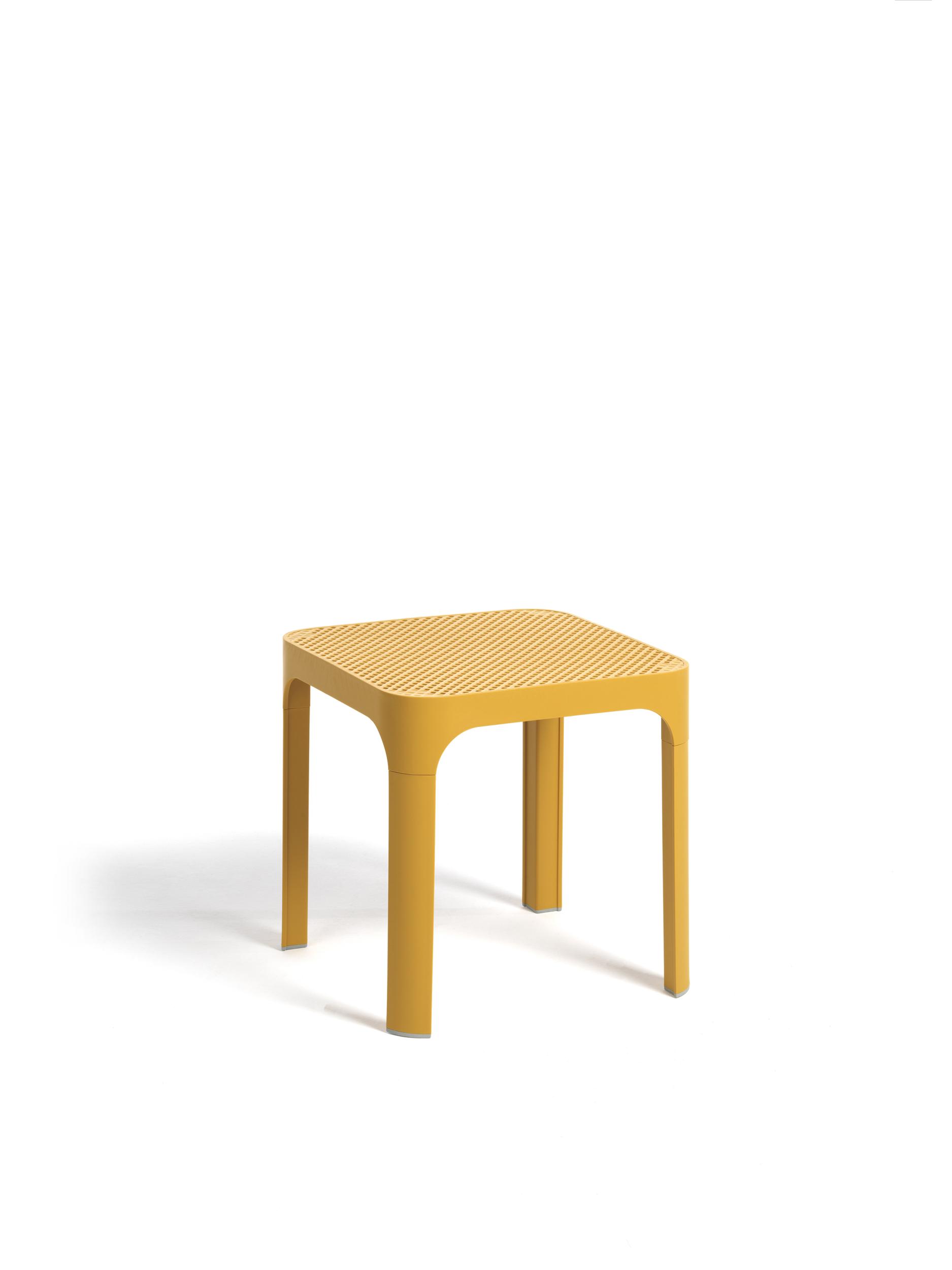 Soffbordet Made in Italy finns i ett brett utbud av färger, är stapelbart och har en perforerad fyrkantig skiva .