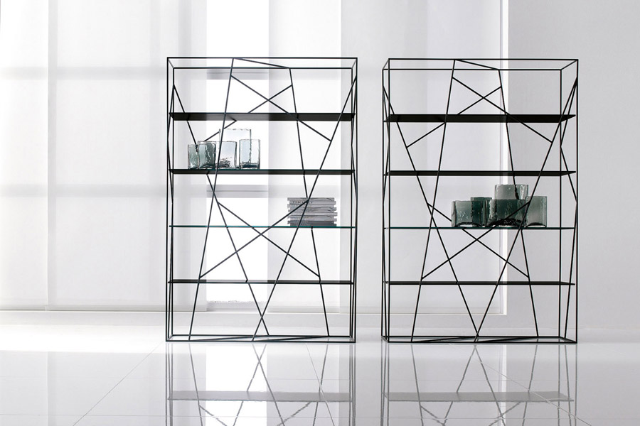 Målad bokhylla i metall med hyllor i glas eller trä.