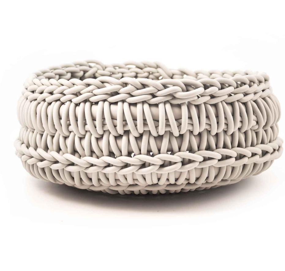 Nest Basket är handstickad med dubbel neoprentråd i olika tjocklekar, vilket ger möbeln en solid men flexibel struktur.