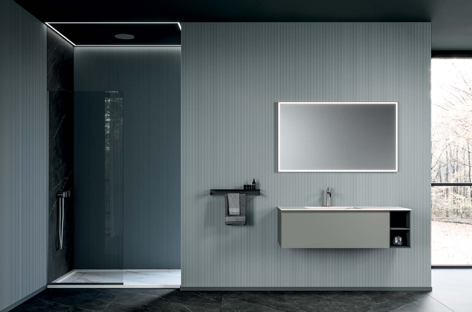 Det integrerade handfatet, som finns i olika versioner, integreras perfekt i skåpets design, medan spegeln med valfri LED-belysning kompletterar rummet med en modern och funktionell touch.