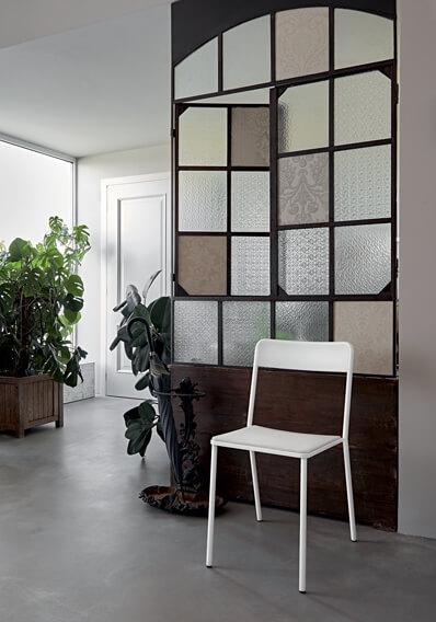 Den finns i två versioner, baserade på en solid rörformad metallstruktur, medan sitsen i 1/4-versionen fortfarande är tillverkad helt av metall men med snidad sits och ryggstöd, vilket gör den visuellt ännu lättare.