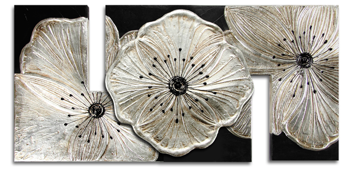 DESIGNPENSE cm 115x55 PLATINUMvariant Blomkomposition på duk, handdekorerad, hartsdetaljer på texturerat material, dubbel L-struktur med centralt element i relief, blank yta.