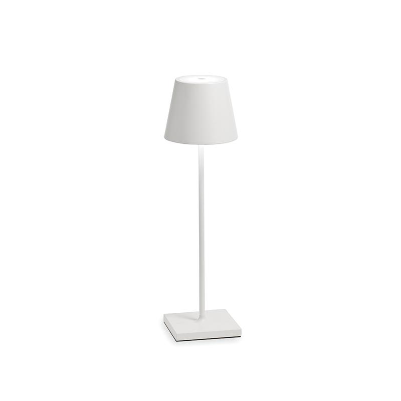 Uppladdningsbar bordslampa med kontaktladdningsbas, med lackerad aluminiumkropp, polykarbonatdiffusor och LED-ljuskälla.