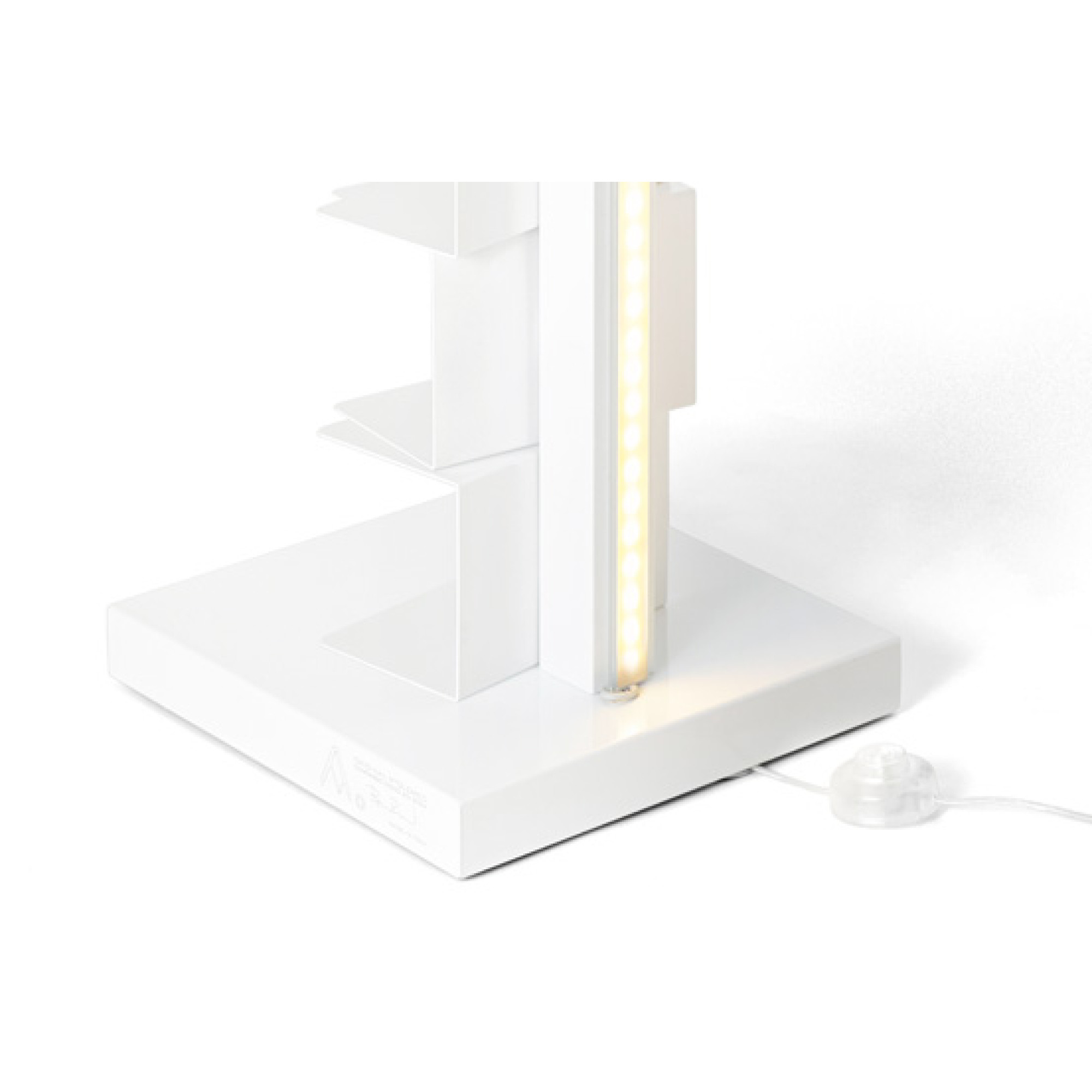 Fristående vertikal bokhylla i metall med direkt LED-belysning, 12V 3000°K. 2,5 m ledning, transparent strömbrytare och kontakt.