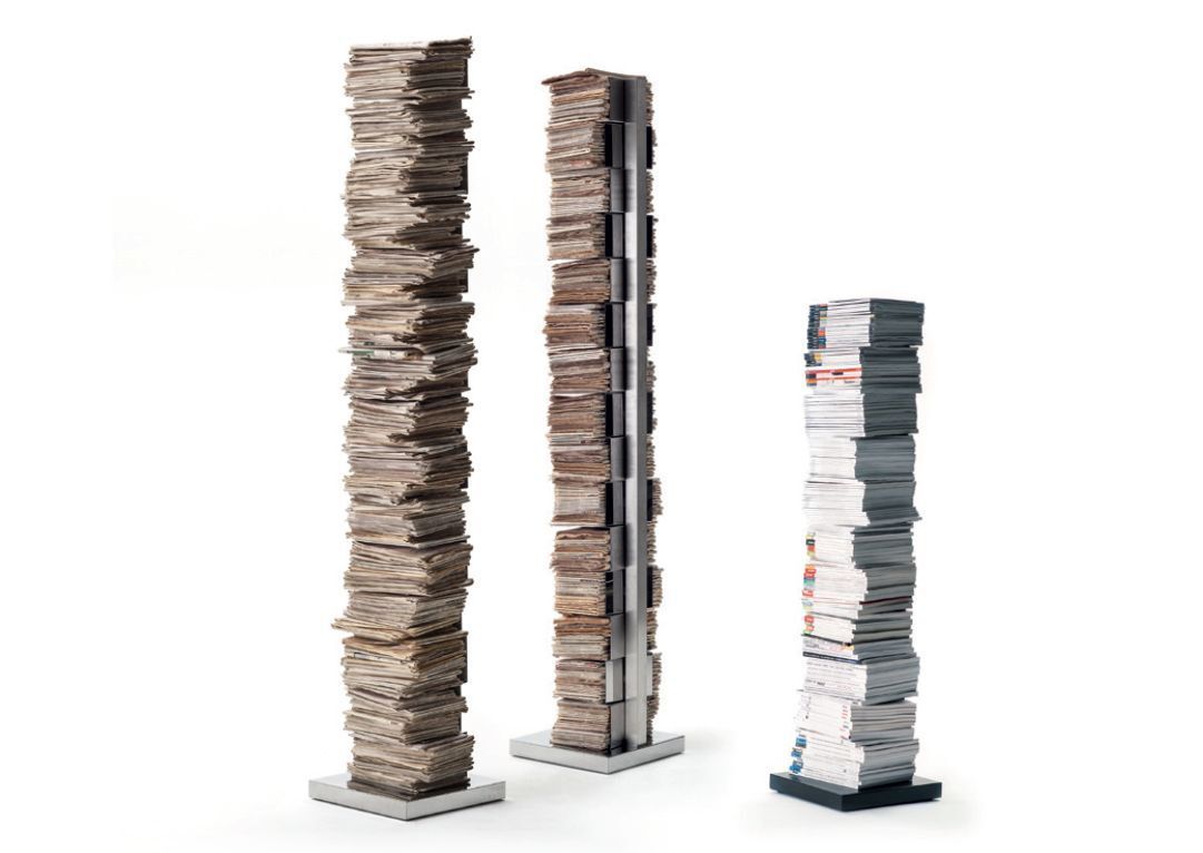 Fristående vertikal bokhylla för storformatsböcker och tidskrifter.