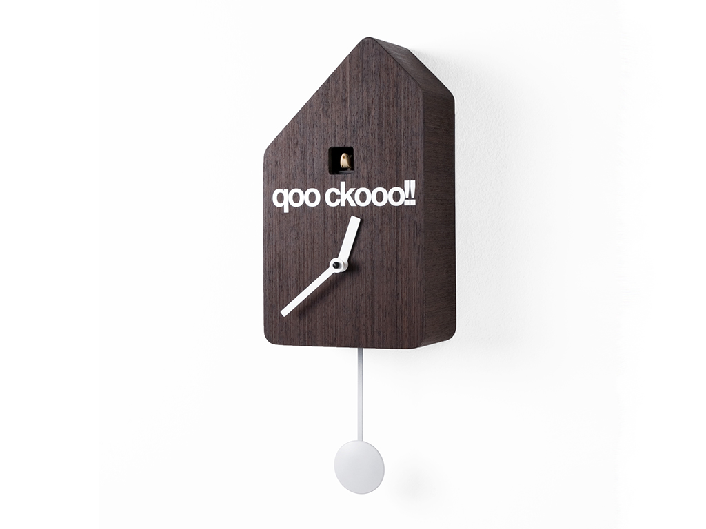 Det klassiska gökhuset har fått en ny presentation på ett modernt sätt med djärva linjer och rena linjer som eliminerar allt överflöd, vilket skapar ett designat gökur med ett distinkt asymmetriskt tak. Den enda dekorationen är mellan fågeln och visarna, och är ordet "qoo ckooo!!" som låter som fågelsång. Batteridrivet kvartsurverk. En ljuskänslig sensor stoppar automatiskt ringningen i frånvaro av ljus.