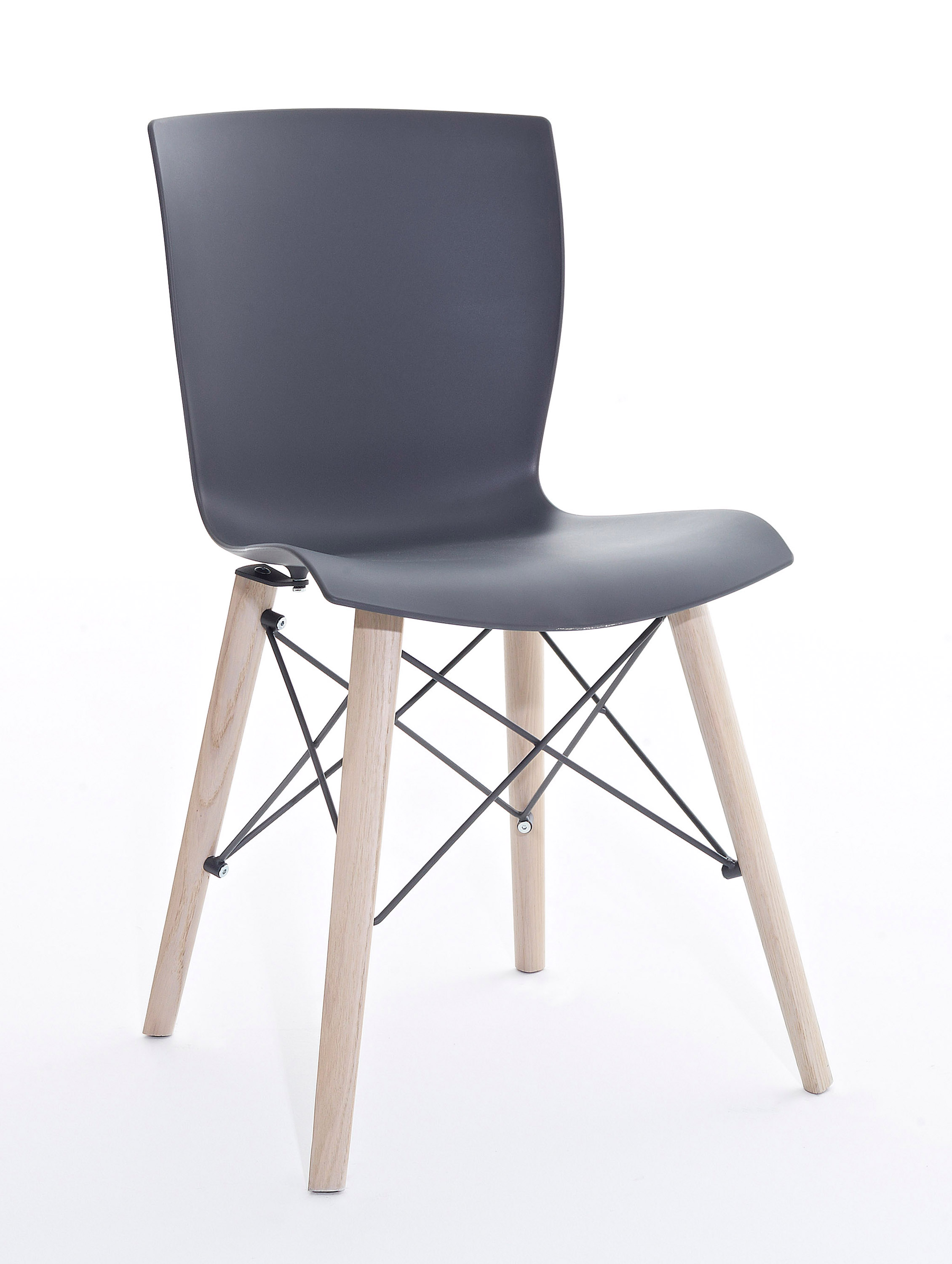 Stol med ram i ekträ och stål samt mjuk sits i polypropen.