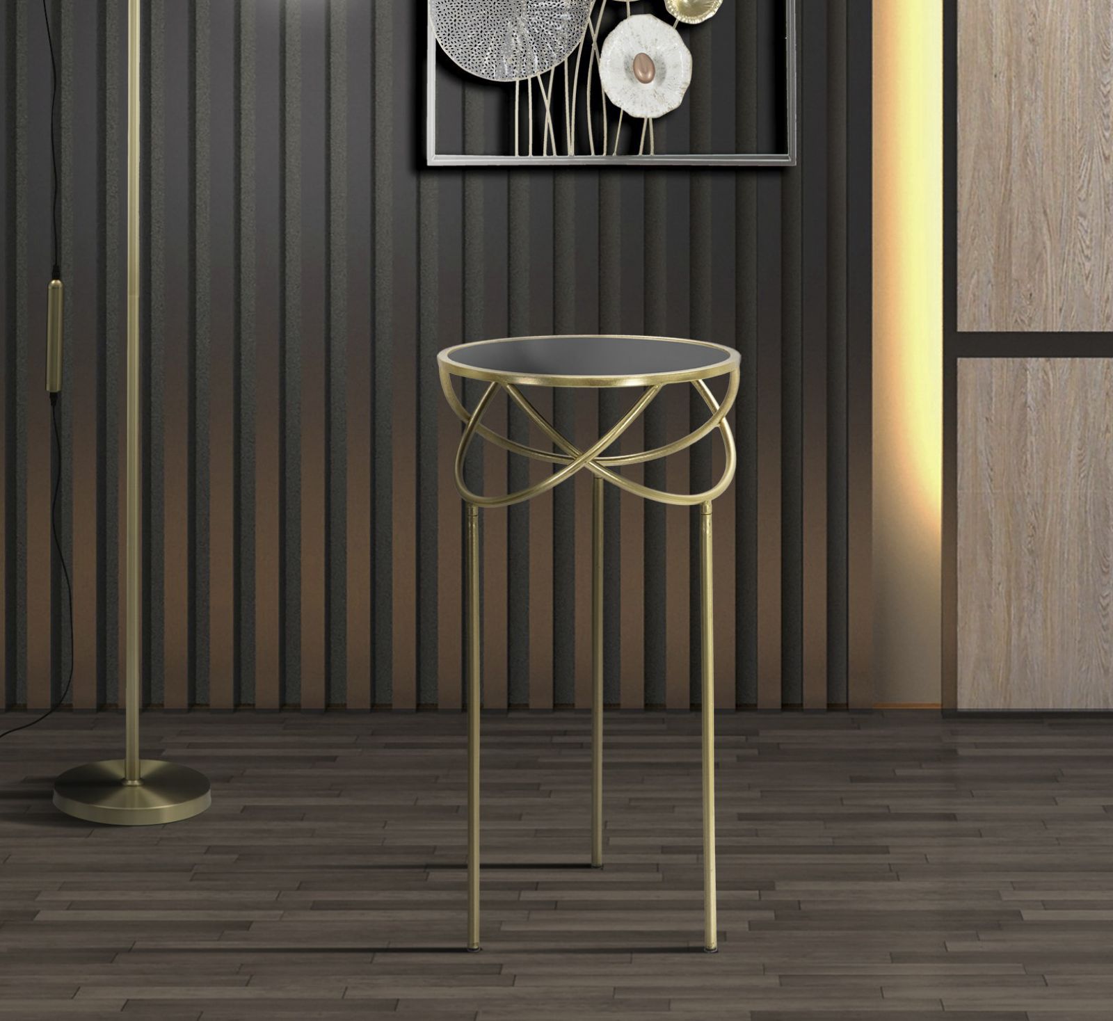 Ett telefonstativ i metall och glas med slingrande, fängslande linjer. Färgerna guld och svart skapar en slående effekt. Ett lyxigt och glamoröst tillskott till ditt hem.